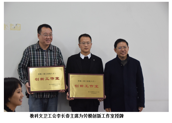 授牌仪式上,刘科副主席宣读了“关于命名一批省高校系统劳模创新工作室的决定”(川工教科文卫[2018]96号),为贯彻省委十一届三次全会精神,弘扬劳模精神和工匠精神,激励创新创造活力,服务我省建设西部创新人才高地,推动全省高校系统劳模创新工作室创建工作向纵深发展,按照全总、省总工会文件的要求,省教科文卫工会在直属高校,命名了28个劳模创新工作室,其中,我校荣获4个劳模创新工作室。