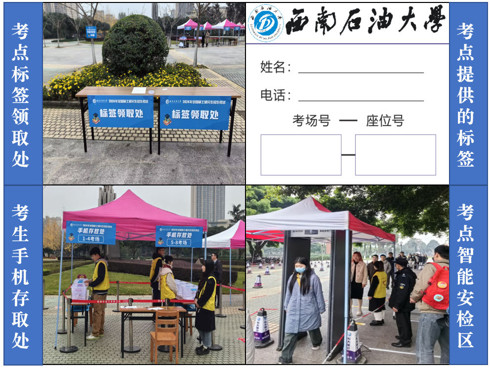 考生进入考点后,先自行到“标签领取处”领取考点统一提供的标签,规范填写个人信息(按照准考证,正确填写的考场号、座位号)。在指示牌、现场志愿者的指引下,到对应考场的“手机存取处”存放手机,然后前往“智能安检区”安检,经安检无异常后进入考场。(12月20日下午校外考生查看考场期间将有志愿者提前发放标签,考生可提前领取;校内考生将会同学工部提前发放标签)