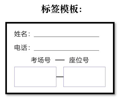 考生可按照下图标签模板,自行制作标签,提前在标签上填写好基本信息(请对照准考证正确填写的考场号、座位号)。