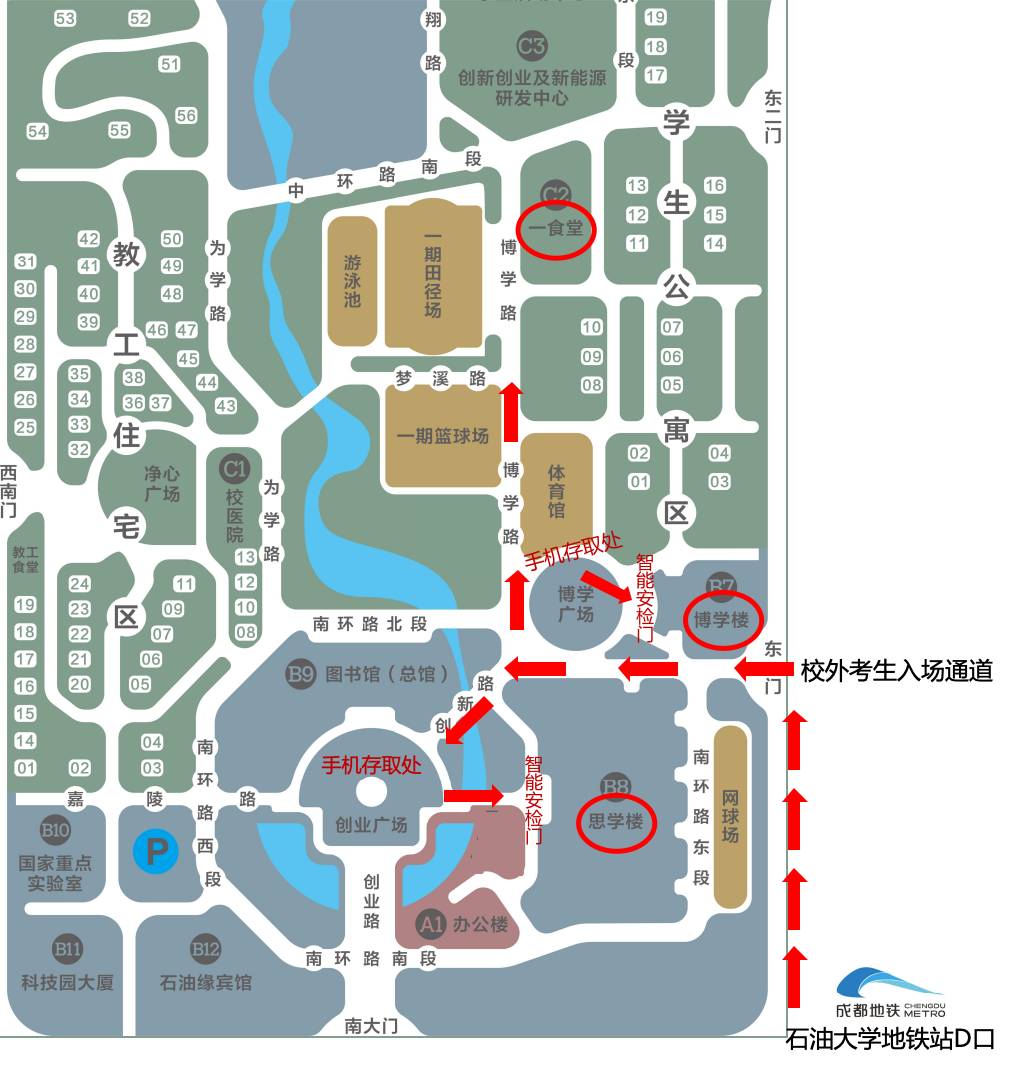 因校本部考点外来考生众多,校园周边及校内停车位紧张,校园内不提供停车,为避免考生因交通拥堵耽误考试,请校外考生不要驾驶机动车前往考点,建议乘坐公共交通(可乘坐地铁3号线到“石油大学”站下车)或亲友送考,由东大门(新都区大学路123号)进入考点。