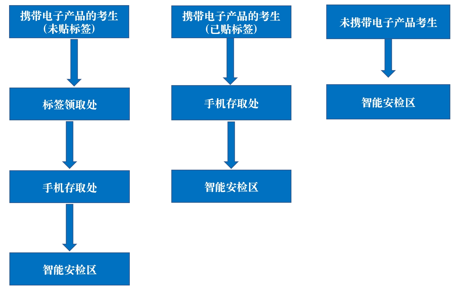 1.未携带手机、电脑、平板、手环、手表、耳机、智能眼镜等通讯设备的考生,可直接前往智能安检区安检,经安检无误后进入考场。
