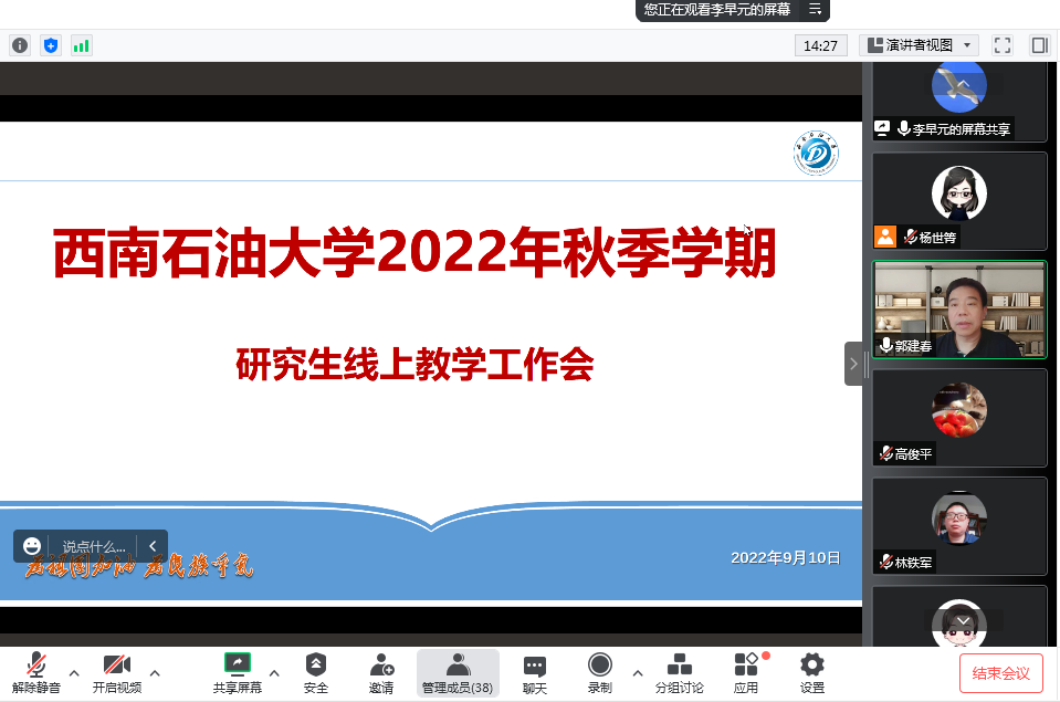 9月10日下午,学校组织召开2022年秋季学期开学研究生线上教学工作视频会议,学校党委常务、副校长郭建春出席会议。郭建春强调,一定要高度重视、广泛动员和顺利推动线上教学实施。