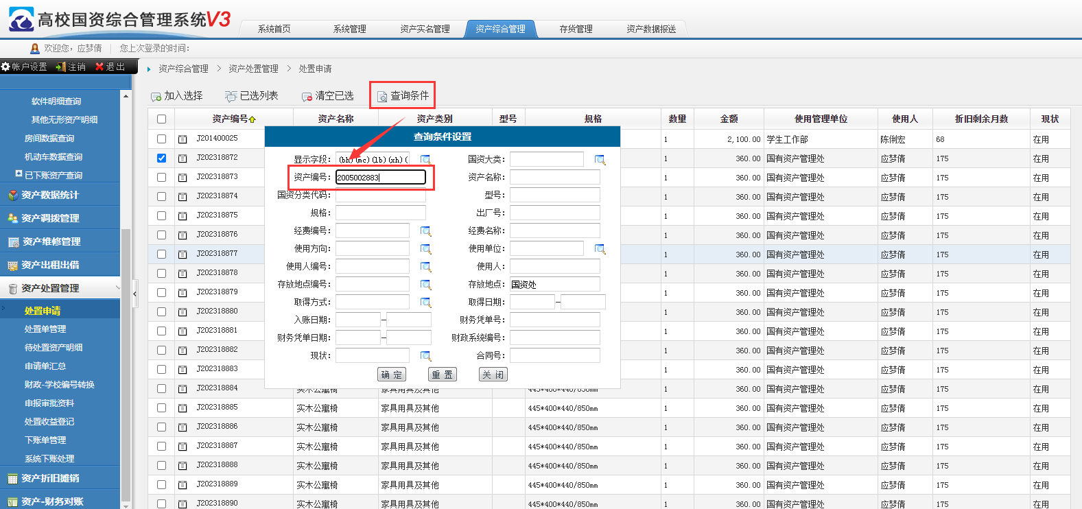 第三步:点击查询条件,输入对应资产编码,点击确定