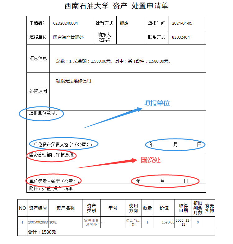 第八步:填报单位签字盖章完成后,成都校区交到后勤楼425应梦倩老师处,南充校区交到后勤小院家具管理办公室马光毅老师处,完成报废