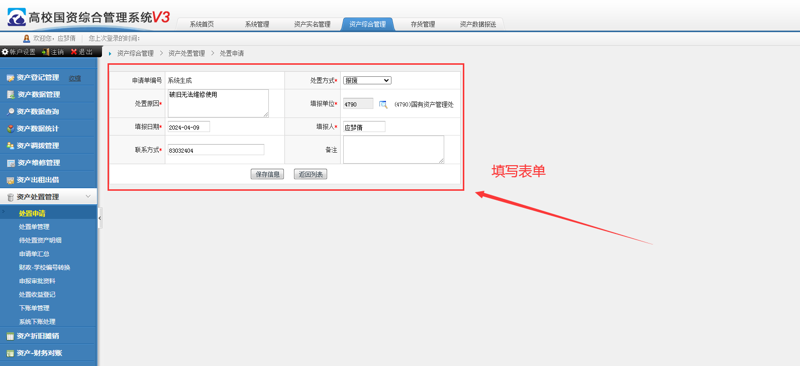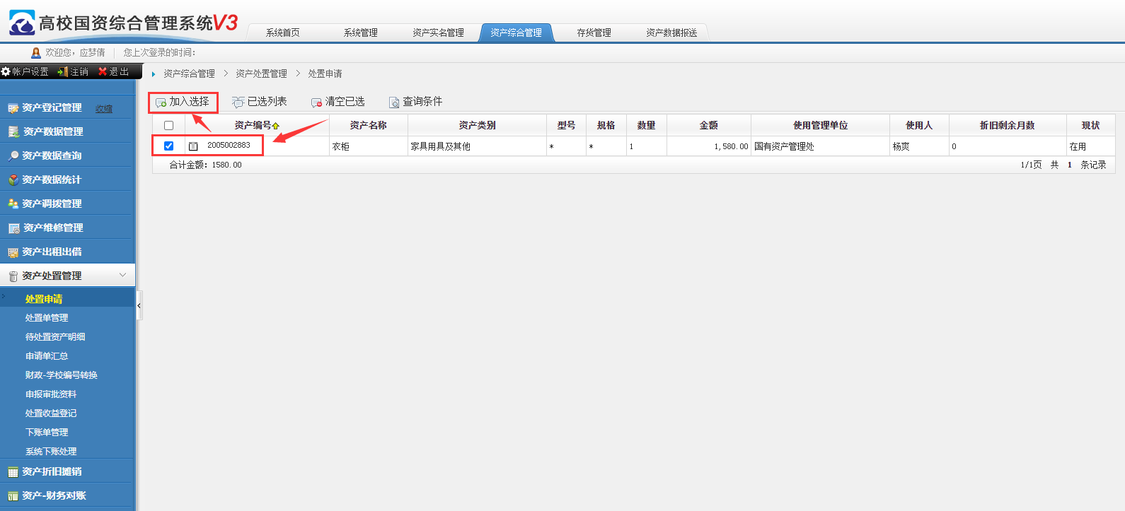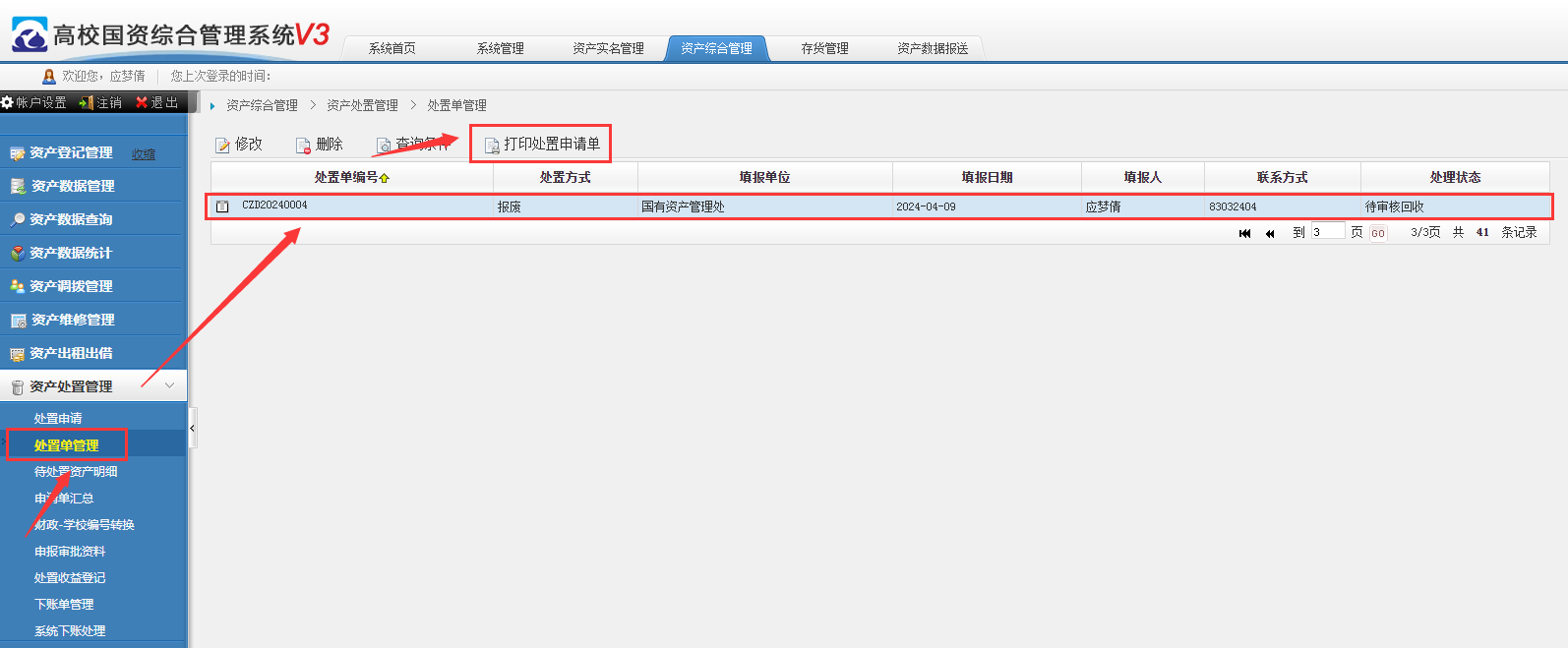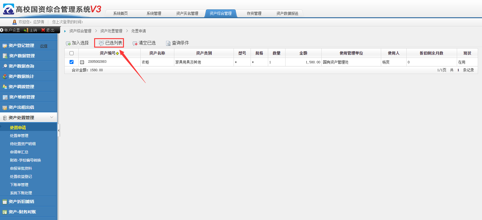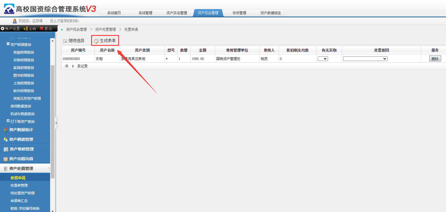 第七步:点击处置单管理,选中要报废的家具,打印处置申请单