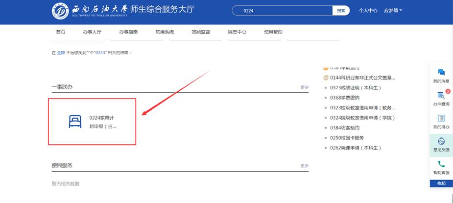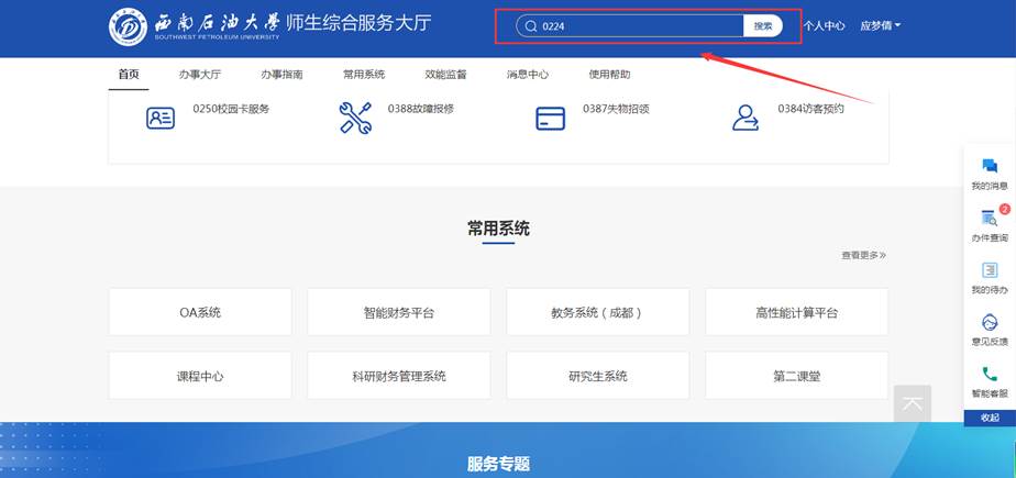 第三步:进入师生综合服务大厅,输入0224,点击搜索