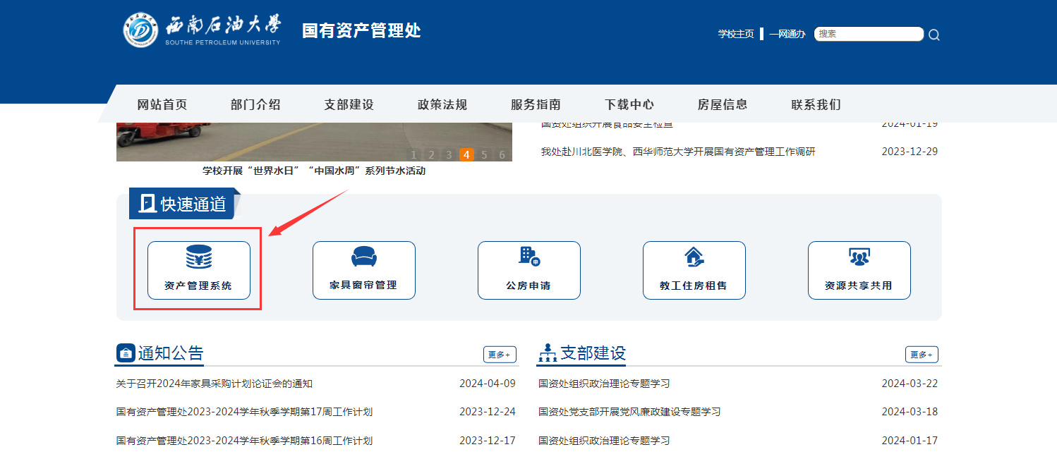 登录学校官网,找到机构设置,进入国有资产管理处网站,下拉菜单至快速通道,点击资产管理系统(若未登录一网通办,则需要输入一网通办的账号(工号)和密码,即可登录)
