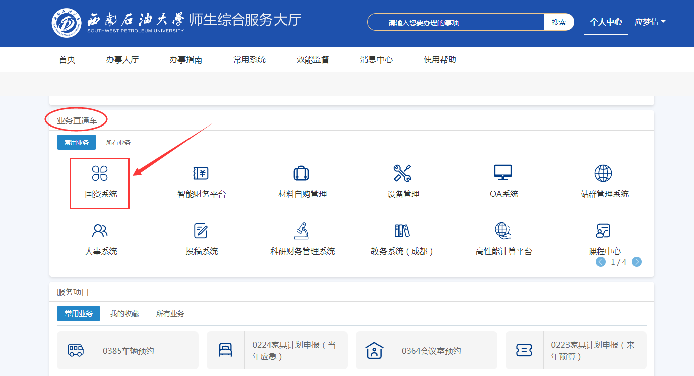 第四步:点击个人中心,下拉菜单至业务直通车,点击国资系统即可进入
