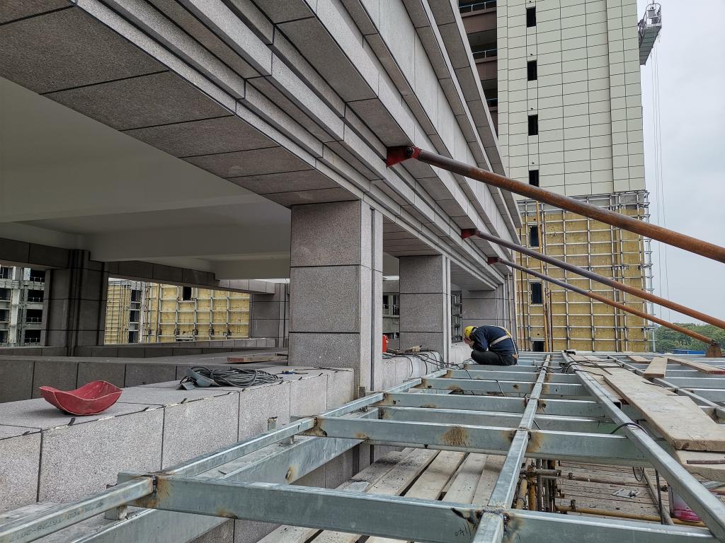 明德博创公司负责人介绍了项目施工进度:室外部分商铺雨棚正在安装,外墙一体板和石材即将安装完成,阳台墙面贴保温板及刮抗力裂砂浆,总平部分及围墙正在施工。室内正在进行外窗玻璃固定、公共区装修吊顶龙骨焊接、墙地砖贴砖工作。项目施工进度可控,整体按施工计划进行。