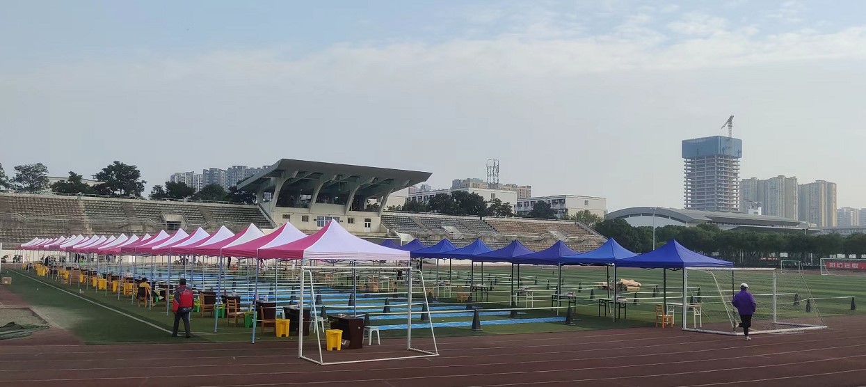 搬物资、摆桌椅、搭帐篷、铺一米线、拉警示带……不到2个小时,家具库房管理员郑康地就和保卫处、后勤部等部门的工作人员合力完成了54顶帐篷、50张桌子、74把椅子、50顶照明灯、125个锥形桶及全场警戒线的布置工作。