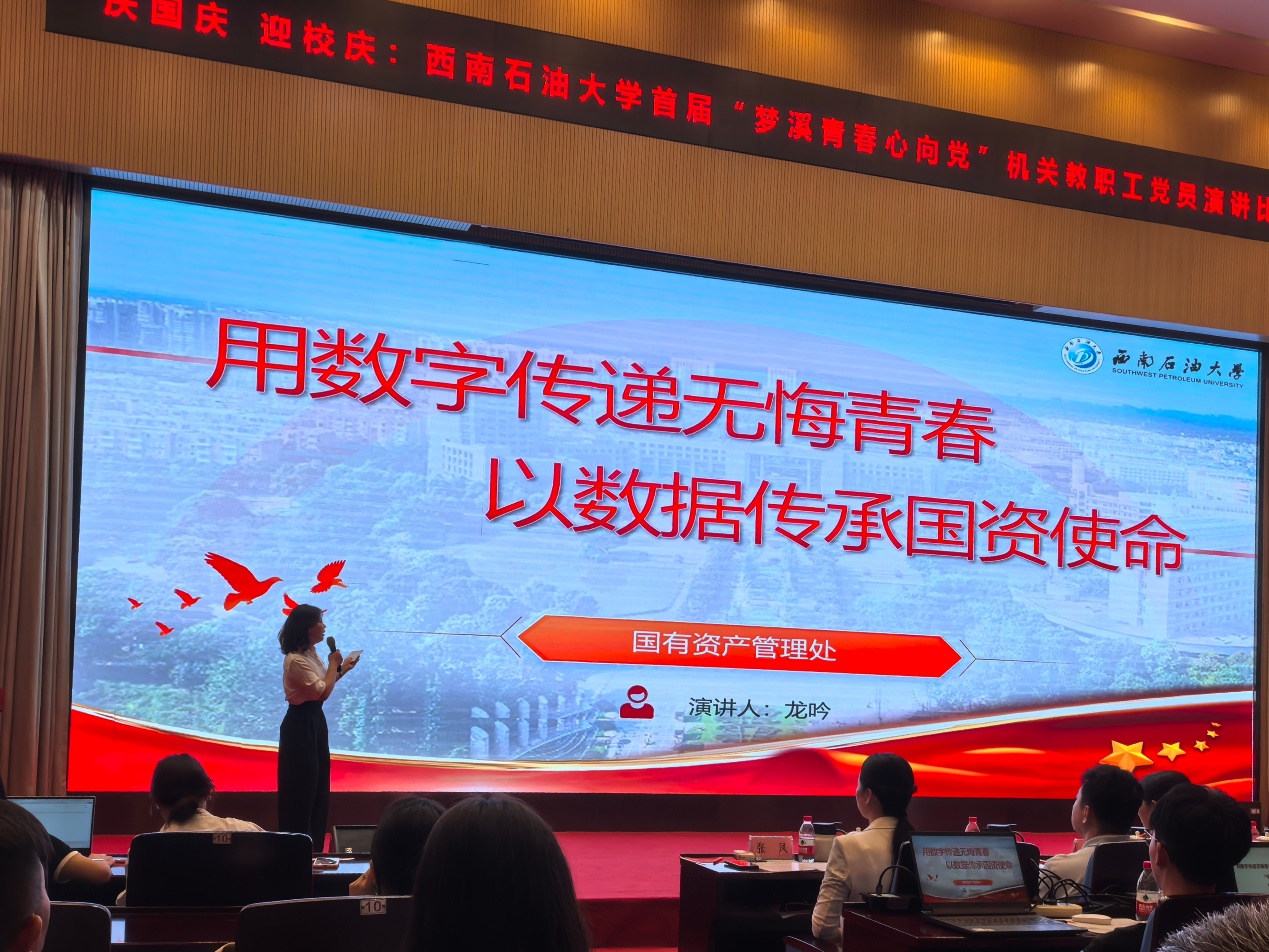 9月23日,西南石油大学首届“梦溪青春心向党”机关教职工党员演讲比赛在图书馆学术报告厅举行,国资处青年党员龙吟以《用数字传递无悔青春 以数据传承国资使命》为题参加演讲,荣获二等奖。