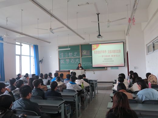 为发挥党支部的战斗堡垒作用,增强党支部的活力,创新基层党建工作模式,11月27日下午14:30,档案馆党支部与化工院学生党支部在明德楼A302教室开展了“基层组织手牵手,支部共建促发展”的启动仪式。活动以 “学习校史,共筑石大”为主题。档案馆馆长姚明淑、化工院党委副书记蒲冠州、化工院学生党支部代表、档案馆教职工党员代表共计60余人参加了本次活动。活动由化工院团委书记张勇主持。 化工院党委副书记蒲冠州介绍了学生党支部的基本情况、学生党建工作概况。他指出学生党建工作有其自身的特点,比如学生党员的社会经验不足、政治理论水平不高、组织生活单一等,而档案馆教工支部和教工党员自身的优势和特点,恰好能够弥补学生支部和学生党员这方面缺陷。因此档案馆党支部和化工院学生党支部结对共建活动应运而生,这是是探索建立学生党员“长期受教育、永葆先进性”长效工作机制的有益尝试。 档案馆馆长姚明淑就支部结对共建的活动目的、活动载体作了详细介绍,她表示关心帮助学生的成长是我们所有教职员工的责任和义务,支部结对共建活动为档案馆教职工党员参与学生思想政治教育工作,引导学生健康成长提供了一个新的渠道和平台。对于如何共建,姚明淑表示,一要在思想上高度重视;二要在组织上加强领导;三要在环境上积极支持;四要在结果上共同收获。姚明淑还结合本学年度的“六个一”共建方案,对如何“共同组织一次主题实践教育活动、共同组织一次党志愿员服务、共同组织一次校史知识竞赛、共同开展一次文体活动、共上一次党课、共读一本好书”进行了工作布置。 档案馆副处级调研员罗杰老师用详实的数字、生动的案例生动讲述了学校近60年的发展历程等,激发广大学生爱学校、爱学习的热情。化工院学生党员刘圆分享了自己大一到读研二的学习、生活、工作中的点滴。 启动仪式上,姚明淑还向化工院学生党支部赠送了李开复撰写的《给最好的自己》的书籍,受赠学生党员表示,他们很高兴收到档案馆老师们赠送的“精神粮食”,有了这些书籍,他们便可以多利用些时间拓宽视野,提高内心修养,同时对自己的职业规划也有很大的指导作用。