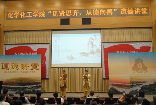 为贯彻、落实学校关于开展道德讲堂活动的通知精神,大力弘扬“存好心,做好事,当好人,有好报”的价值取向,进一步增强师生员工的思想道德建设,积极践行社会主义核心价值观,6月17日下午16:30化工院在图书馆学术报告厅“见贤思齐,崇德向善” 道德讲堂正式开讲了,化工院全体党政领导、教职工党员、学生党员代表参加了本次活动。活动由化工院党委书记陈馥主持。