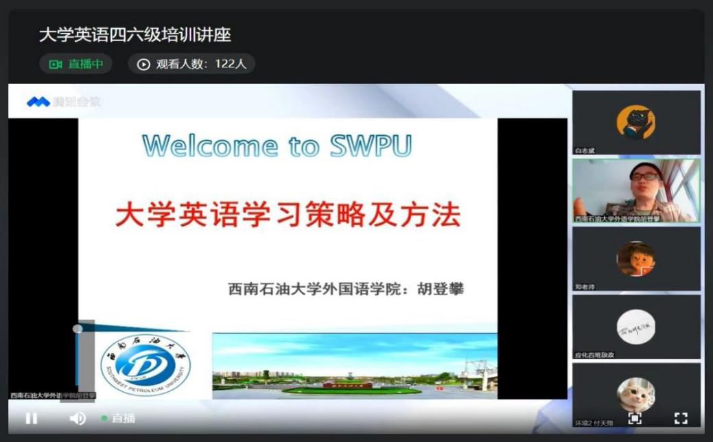 图1线上讲座场景 讲座中,胡老师以SWPU为何意开始,主要围绕“为什么要学好英语”以及“怎么学好英语”这两个问题,用风趣的语言让同学们了解到大学英语的重要性,同时教给同学们大学英语的学习方法,要从“听、说、读、写、译”五个方面来学习大学英语。在讲座的最后,胡老师还特别鼓励英语基础差的同学们不要害怕学习英语,要相信自己一定能学好英语。
