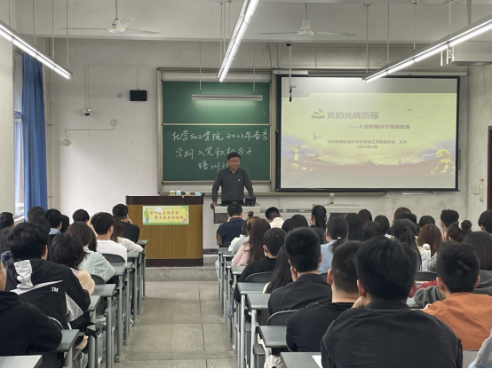 为严格把好党员发展“入口关”,全面提高入党积极分子教育培养水平,4月13日下午,化学化工学院2023年春季学期入党积极分子培训班正式开班。学院党委书记王兵,培训班指导老师阚文华、彭怀雪出席开班仪式。 大会伊始,阚文华老师对培训班学习作纪律要求,希望学员们时刻严格要求自己,积极参加学习活动,讲究方式方法,要对学习到的理论知识入脑入心,做到思想上有领会,学习上有示范,生活中有修养、行动上守纪律。 王兵书记指出本次培训班旨在加深入党积极分子对党的认识和了解,提高思想觉悟,端正入党动机,提升发展质量。王兵书记希望全体学员不断加强政治理论学习,坚定理想信念,增强党性修养,敢于担当,早日迈入党组织的大门,成为一名真正的共产党员。 随后,王兵书记为学员们讲授《党的光辉历程》主题党课,带着学员们循着中国共产党的历史发展轨迹,探寻中国共产党的成功奥秘,激励学员们不忘初心、接续奋斗,做政治素质过硬、思想道德突出、专业技能精湛的社会主义合格建设者与可靠接班人。 图文/李菁 审核:彭怀雪