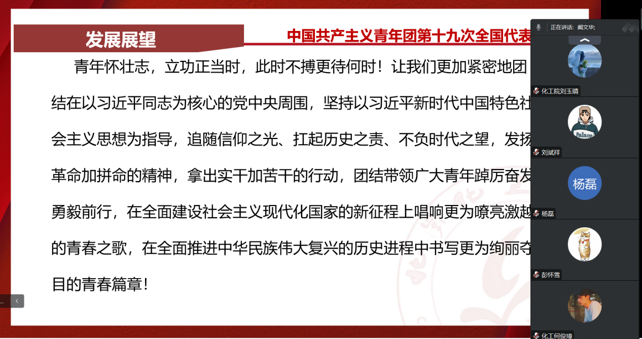 为深入学习中国共产主义青年团第十九次全国代表大会精神,2023年7月6日,化学化工学院团委学生会69名师生干部参加学习。会议由化学化工学院团委书记郑璇老师主持。 首先,介绍了本次团十九大的主题,揭示了大会以习近平新时代中国特色社会主义思想为指导、全面贯彻党的二十大精神的本质。其次,从国家重大战略布局角度分析了中国共产主义青年团在祖国发展的方方面面发挥的巨大作用,尤其强调了团对于青年的深刻影响。接着,提出了新时代中国青年的使命担当,这让参与会议的同学们都认识到身为新时代青年,一定要自信自强、担当奋斗、团结一心、开放包容,坚定不移跟党走,展现出新时代的中国风尚。 随后,郑璇老师又带领大家一起学习了如何用习近平新时代中国特色社会主义思想统领共青团的工作。郑老师结合学院团委工作实际,对学院新一届团委学生会的相关工作进行安排部署,明确今后的工作方向和工作要求,鼓励大家要以更高的要求、更积极的行动和更大的热情投入到共青团工作中,充分发挥学院团委的引领力、组织力、服务力和贡献度。 团委学生干部宁俊涛也在会上分享了自己的感想,作为学院团委学生会的一员,势必要贯彻落实大会传递的精神,谦虚谨慎、团结实干,结合学院新的工作部署,积极发挥学生干部的领头作用,做好学院新一届团委学生会的建设工作,以饱满的精神投入接下来的工作任务。 通过本次专题讲座学习,化工院师生们对于团的十九大精神都有了更深入、更全面的理解,对于中国共产主义青年团的历史使命、发展方向、工作任务也展开了更多的思考。相信在本次学习之后,同学们也将以最大的热忱投身奋斗者行列,更加紧密地围绕我党我团,扛起使命担当,追随信仰之光,不负时代热望,以最绚丽的青春为底色,书写中华民族伟大复兴历史新征程的壮丽篇章。 文/钟雅菲 图/宁俊涛、毕赢 审核/阚文华