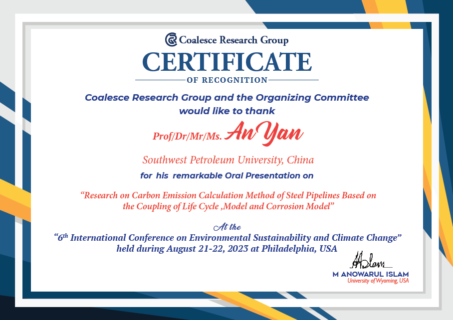8月21日至22日,我院化学工程与技术2023级博士生颜安参加了在美国费城举办的主题为“6th International Conference on Environmental Sustainability and Climate Change”的国际会议,并在21日晚做了题为《Research on Carbon Emission Calculation Method of Steel Pipelines Based on the Coupling of Life Cycle Model and Corrosion Mode》的学术报告,对钢铁材料全生命周期碳排放进行了核算,显示出腐蚀防护能够显著降低全生命周期年均碳排放,提出了一种降低钢铁材料碳排放的新方法。随后与会场专家学者进行了深入地学术交流,引起了广泛讨论。 该学术会议由Coalesce Research Group举办。本次会议邀请来自中国、美国、英国、德国、以色列、印度、韩国等多个国家和地区的几十位从事环境科学的专家、学者,其围绕气候变化、全球变暖、可持续发展、低碳社会等目前国际上的热点问题分享了各自研究的最新成果和进展。