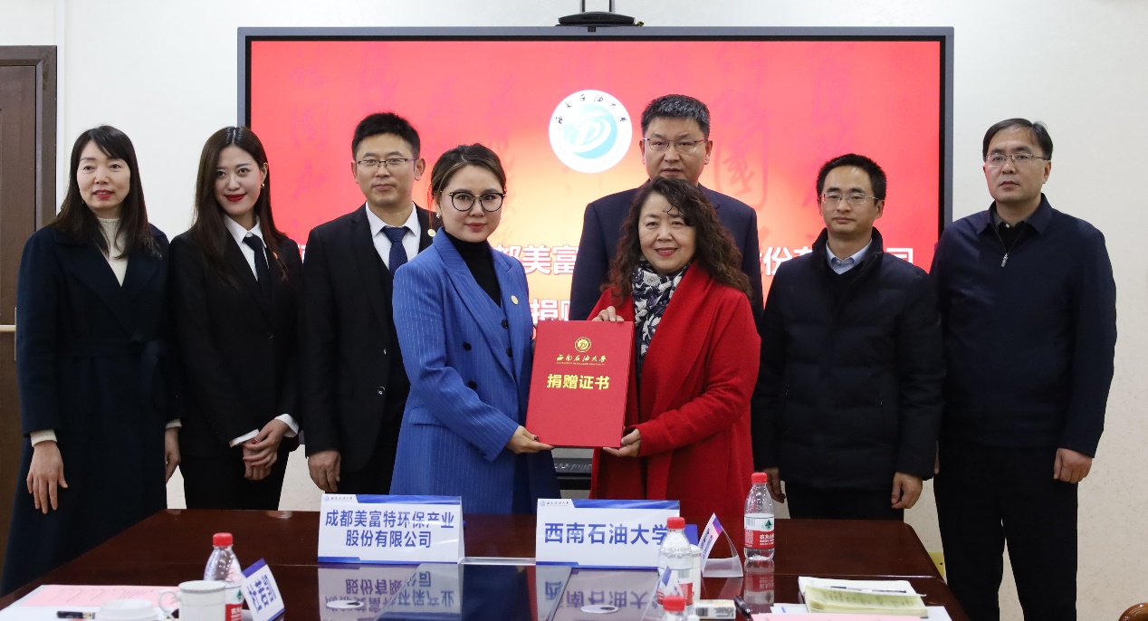 1月12日,成都美富特环保产业股份有限公司向学校捐赠人民币30万元仪式在办公楼209举行。成都美富特环保产业股份有限公司总裁李群英、副总裁杜若凯、人力资源中心总监贺晶、总裁助理冯泉华,校党委副书记、工会主席衡彤,党委学生工作部副部长张浩,校友总会副秘书长、教育发展基金会秘书长刘恒,化工院党委书记王兵、党委副书记陈刚等校企领导和师生代表共同参加了仪式。 依据协议,成都美富特环保产业股份有限公司将从2024年起连续三年每年向学校教育发展基金会捐赠人民币10万元,用于在化学化工学院定向设立“美富特励志成才奖学金”,奖励化工院品学兼优、全面发展的家庭经济困难本科生和研究生,助力学生成长成才。