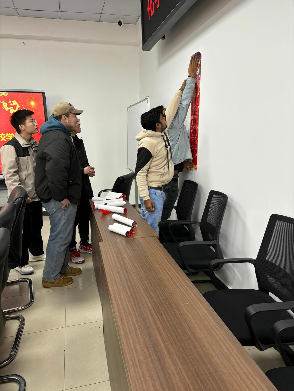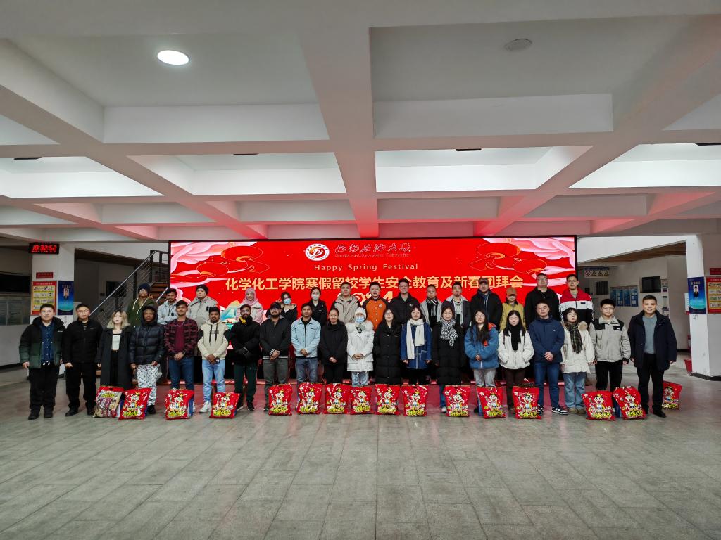 2月7日上午10:00,化学化工学院2024年寒假留校学生新春团拜会在明德楼A523会议室举行。化工院副院长王林元、实验教学中心卿大咏、辅导员代表白志斌,及全院留校学生30余人齐聚一堂,欢庆龙年新春佳节,喜迎2024农历甲辰新年。 王林元代表学院向寒假留校学生致以节日的问候和新春的祝福,他亲切询问留校学生的学习和生活情况,提醒同学们注意劳逸结合,叮嘱同学们在校注意安全,多与家人亲友联系,对于即将到来的农历新年,他祝福大家身体健康,工作顺利、学习进步、龙年大吉,也祝愿学院在新的一年里兴旺、圆满。卿大咏老师也为同学们送上新春祝福,同时进行了安全教育,提醒同学们切实注意人身安全,共度平安美好佳节。 为使留校学生度过一个快乐充实、平安祥和的春节,学院开展了新春团拜会,发放春节慰问品等活动,同学们共同参与会场布置,还特意让留学生体验了贴春联,让同学们感受到了浓浓的年味。材料与化工专业2021级研究生范尚华表示:“虽然没有回家,但是在学院这个大家庭里感受到了浓浓的年味和温暖”;国际学生MATIAS表示:“春节之际,在学院感受到了中国传统节日的浓厚氛围,感谢学院让我们在这里有了家的感觉”。 文/白志斌 图/范尚华