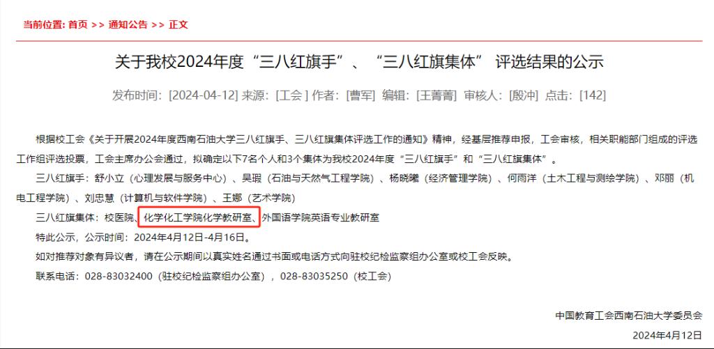 为表彰先进、树立榜样,激励全校广大妇女跟党奋进新征程、巾帼建功新时代,学校授予7名个人和3个集体为2024年度“三八红旗手”和“三八红旗集体”,其中,我院化学教研室荣获学校2024年度“三八红旗集体”。
