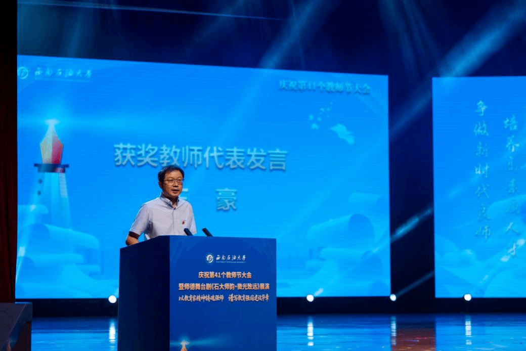 三、彰显榜样引领力量:先进表彰树立标杆 在学校教师节庆祝大会上,学院教师王豪、刘梅及王兵创新工作室代表任宏洋作为教师先进个人和先进集体受到表彰,王豪老师作为获奖教师代表分享了自己用“坚持”和“坚信”坚守育人初心使命的故事。这些表彰既是对老师们深耕教学科研、勇攀学术高峰的肯定,也是学院长期以来坚持“以师德铸魂、以创新驱动”育人理念的成果体现。学院号召全体教师以先进为榜样,严谨治学、甘为人梯,争做新时代“大先生”。