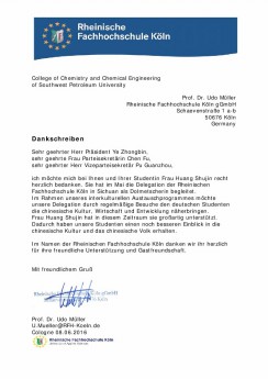 大一时作为翻译参加高层会议“2015职业教育与城市发展高层对话会”的经历,让黄书瑾有了经验与信心,也让她顺利争取到了此次作为德国科隆莱茵应用技术大学访问团的随行翻译的机会。在此次随行翻译中,黄书瑾同学陪同访问团参观了多处大学,对中国的文化、经济、民俗以及自然风光提供了恰当的翻译,为德国科隆莱茵应用技术大学带去了很大的帮助。