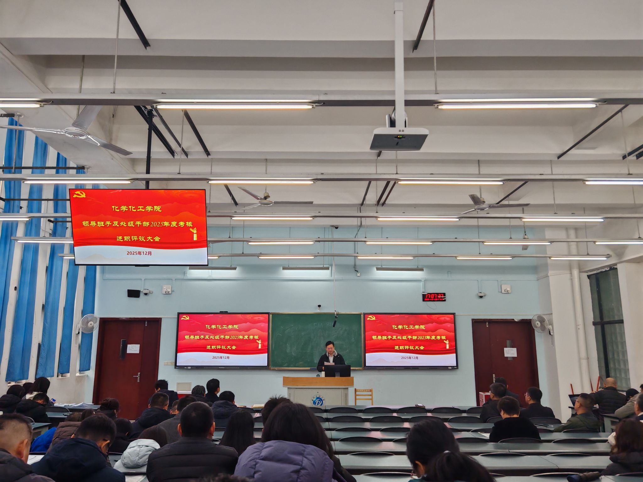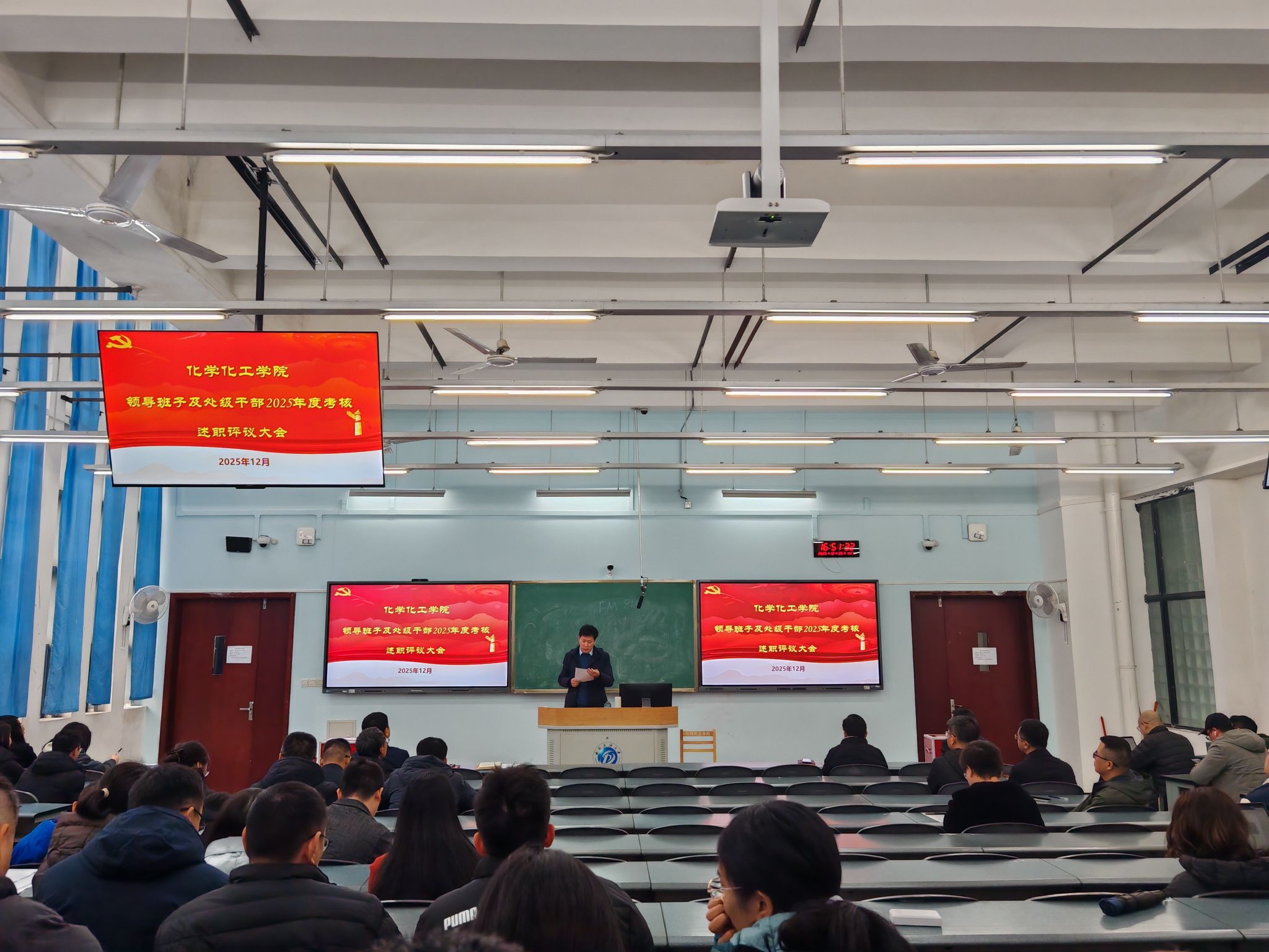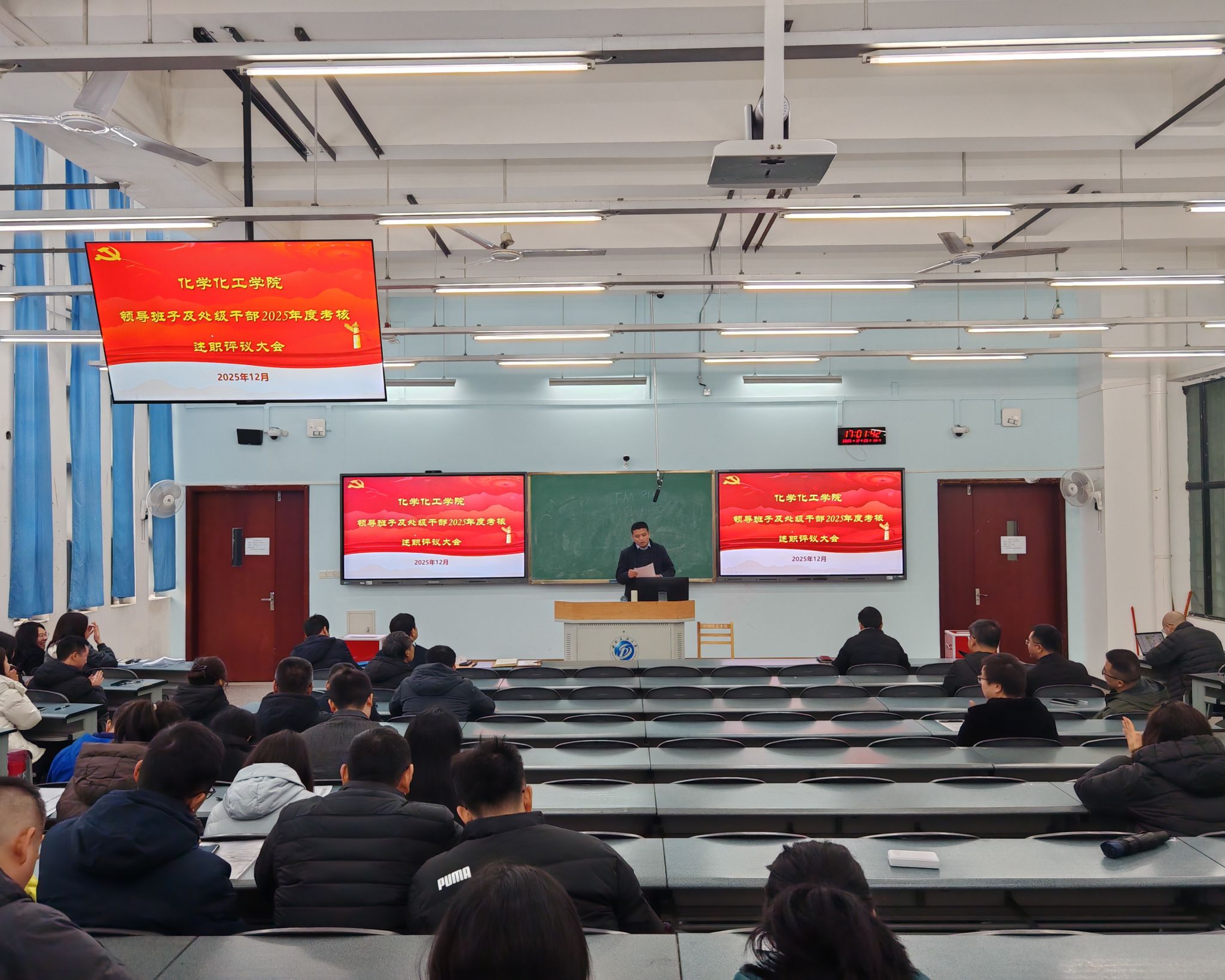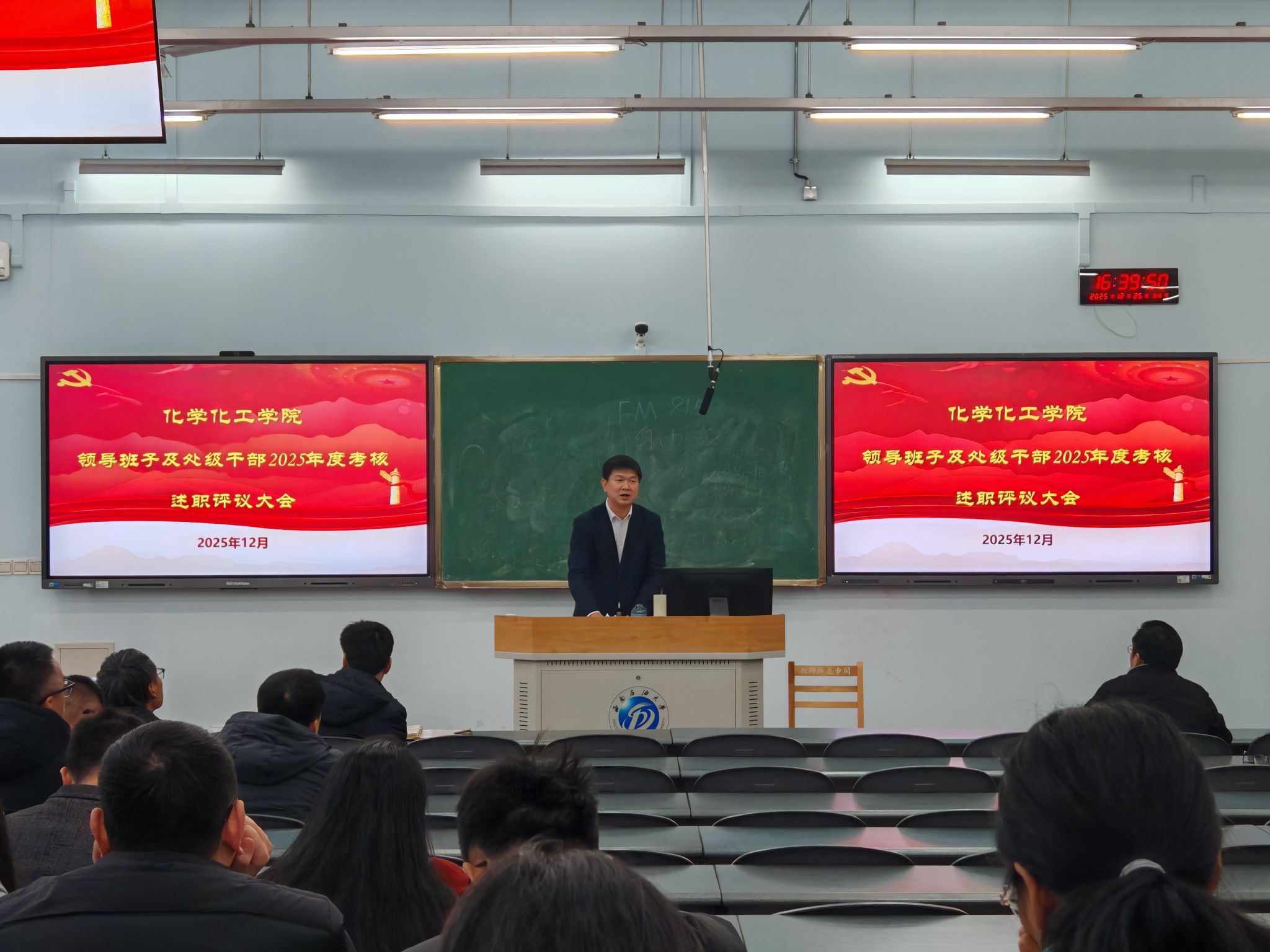 为全面总结2025年度工作成效,客观检视问题不足,科学谋划来年发展方向,进一步强化领导班子建设和干部队伍管理,根据学校要求,12月25日下午,化工院党委在明德楼A312召开2025年度处级领导班子和领导干部述职及民主测评大会。会议由学院党委书记蒲冠州同志主持,学院全体教职工和学生代表参加会议。 会上,蒲冠州代表学院领导班子作党建工作述职,从筑牢思想根基、压实党建责任、深化党建与业务融合发展等多个方面全面总结了2025年学院党建工作开展情况、特色举措和实际成效,分析了学院目前发展中存在的不足,并结合实际提出了2026年党建工作改进方向和重点任务,明确要以高质量党建引领学院高质量发展。 随后,学院领导班子成员依次结合各自分管工作内容,严格对照“德、能、勤、绩、廉”五个方面要求进行个人述职。述职过程中,各位班子成员紧扣年度工作目标,全面梳理了个人在履职尽责、攻坚克难、作风建设等方面的工作成果,重点分享了在推进专业建设提质、科研项目攻关、人才培养改革、学生成长成才等关键工作中的具体做法和实际成效。同时,大家深刻剖析了自身在工作思路创新、统筹协调能力、服务师生精细化程度等方面存在的不足,并立足岗位实际,明确了2026年度的工作思路、具体举措和努力方向。 述职结束后,参会的全体教职工和学生代表本着客观公正、实事求是的原则,对领导班子述职、领导干部个人年度述职进行民主测评。 蒲冠州在汇报中指出,学院发展离不开全体师生的共同努力,学院领导班子将以此次述职为契机,认真梳理总结,狠抓问题整改,切实把述职成果转化为推动工作的强大动力。未来,学院将持续锚定高质量发展目标,以党建为引领,团结带领全院师生凝心聚力、真抓实干,不断提升学科建设水平、强化人才培养质量、激发科研创新活力,推动学院各项事业再上新台阶,助力学校“双一流”建设与高质量发展。