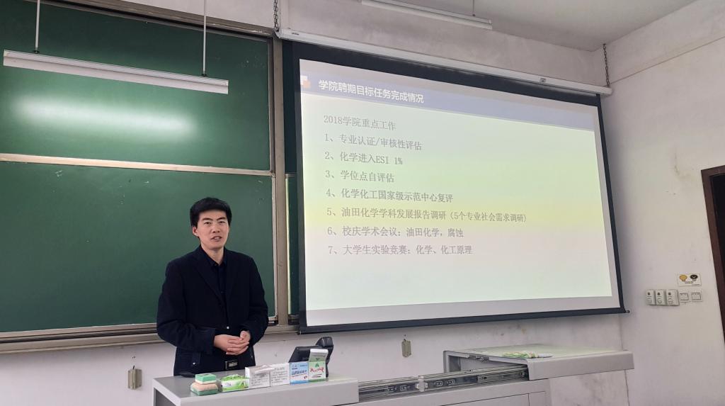 为推进本科教学工作的具体实施,提高教职工教学的积极性。2018年10月18日,化工院于明德楼A401召开全院教职工大会,会议由学院院长段明主持。 会议伊始,院长段明对上一轮目标的完成情况进行了总结,并提出2018年的工作重点:专业认证、审核性评估、化学进入ESI1%、学位点自评估、化学化工国家级示范中心复评、油田化学学科发展报告调研即我院5个专业社会需求调研、校庆学术会议、大学生实践竞赛。对学院现有问题、发展方向做了梳理,指出学院要强化内涵建设、明确办学方向、建章立制和提高人才培养质量。随后,段明以学院教职工聘任方案及结果为重心对学院的新工作进行了讲解。详细地介绍了在不同岗位教学类型的教学工作中,教学质量水平及行政服务的加分扣分原则及考核方式。最后他强调全体教职工应高度重视,各司其职,尽全力保质保量的按时完成各阶段性工作,在此基础上教职工尽可能突破指标完成一些有水平有质量的任务。例如国家自科学基金重点项目、国家科技成果奖、省部级重点实验室、省级创新团队、ESI高信引论文、JACS德国应化、国家在线精品课、青年教师优秀奖、学生学科竞赛奖。 在此之后,副院长张辉对专业认证工作的开展提出了总体要求。最后强调了专业认证准备工作的重要性,并且告知了专家进校考察的日程表,希望教师们予以重视。同时还强调各教师必须加深对工程背景、工程教育核心理念及工程教育认知标准的认识。在教学中,每位教师必须对学生负责,做好人才培养的根本任务,不断提高教学质量。(文/尹露、王宇琦 图/唐胜辉、潘树铭)
