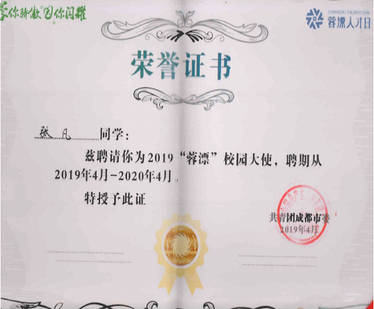 【喜报】化工院学生张凡获聘团市委“蓉漂”校园大使2019-05-21 作者: 编辑:陈刚 审核: 浏览:[]