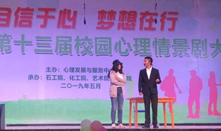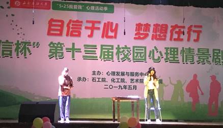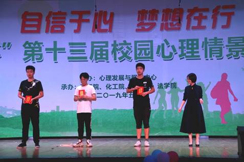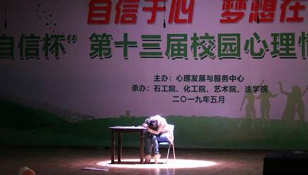5月25晚7:00,由学校心理发展与服务中心主办,石工院、化工院、艺术院、法学院承办的“自信杯”第十三届校园心理情景剧大赛在艺术大楼演播大厅201如期举行。 经过前期初赛、复赛的层层选拔,我院《世界以痛吻我,我要报之以歌》剧组与石工院、经管院、理学院、地科院、土建院的队伍成功晋级,站上了本次决赛的舞台。