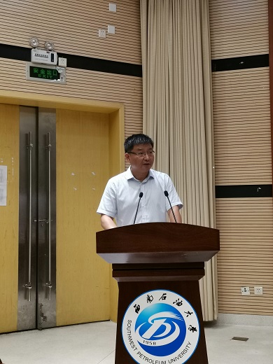 化工院院长段明向新生介绍了学院的基本情况,并提到要把“创新”作为铭文,期望同学们能拓宽国际视野、对标一流榜样,努力成为社会主义建设者与接班人。