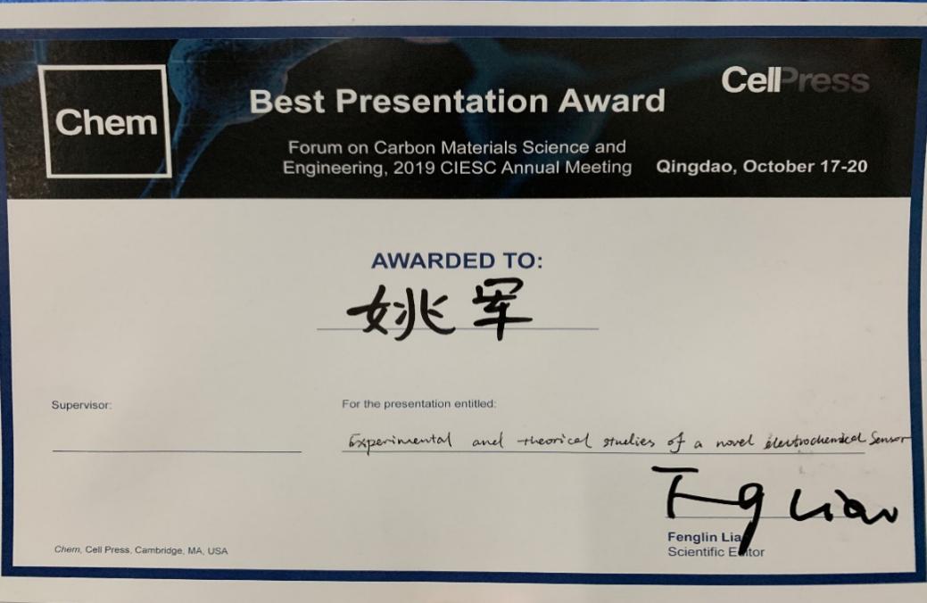 10月17至20日,中国化工学会年会在山东青岛成功召开,本届年会由中国化工学会、山东省科学技术协会联合主办,中国石油大学(华东)承办。年会以“创新引领新时代,化工迈向新未来”为主题,设置开幕式暨主论坛、高端学术特邀报告会、28个专题分论坛及特色论坛、“2019中国化工技术、分析检测、实验室设备展览会”等丰富的专题及配套活动。海内外院士专家参会超过200位,会议规模为2000-3000人。我校化工院姚军老师受邀参加了此次会议,并就“Experimental and Theoretical Studies of A Novel Electrochemical Sensor Based on Molecularly Imprinted Polymer and B,N,F-CQDs/AgNPs for Enhanced Specific Identification and Dual Signal Amplification in Highly Selective and Ultra-trace Bisphenol S Determination in Plastic Products”主题展开相关报告,引起了现场的热烈反响,获得了专家学者们的广泛关注,同时,姚军也被授予“Best Presentation Award”奖。 姚军在新兴电化学传感器领域有着自己独到的见解。会上,姚军从当代电化学的背景入手,全面阐述了自己对电化学发展领域的理解和思考,提出了一种方便、灵敏度高和选择性好的电化学传感器用于实际样品塑料中BPS的测定,该研究的创新点在于将分子印迹聚合物和通过一步微波合成法制备的离子液体修饰的B,N,F-CQDs以及电沉积法制备的AgNPs电极共修饰材料相结合,构建了一种新型电化学传感器,引起了参会人员的热烈讨论。 最后,姚军着重强调了团队合作的重要性,阐述了科研工作者必须以团队为依托才能在职业生涯中取得重要成就的理念,同时表达了对未来化学和化学工程技术的发展充满了信心。他提出,科研工作者应该保持初心,不断探索,努力攀登,才能跨越科学前沿,取得原始突破,促使科学不断发展和进步。 姚军是我校骨干青年教师,曾在影响因子达到54.301的顶级权威期刊Chemical Reviews上以第一作者身份发表了有关荧光纳米材料的ESI高被引论文,该文他引频次超过428次。 注:中国化工学会(The Chemical Industry and Engineering Society of China,简称CIESC)于1922年4月23日在北京成立。是由化工科技工作者和有关单位自愿结成、依法登记成立的全国性、学术性、非营利性社会组织,具有社会团体法人资格,获得民政部评估的5A等级全国性社会组织。中国化工学会年会每两年一届,是我国化工领域国际化、多学科、跨地区的高水平学术盛会,对促进化学工程学术繁荣,推动化工行业科技创新发挥了重要作用。