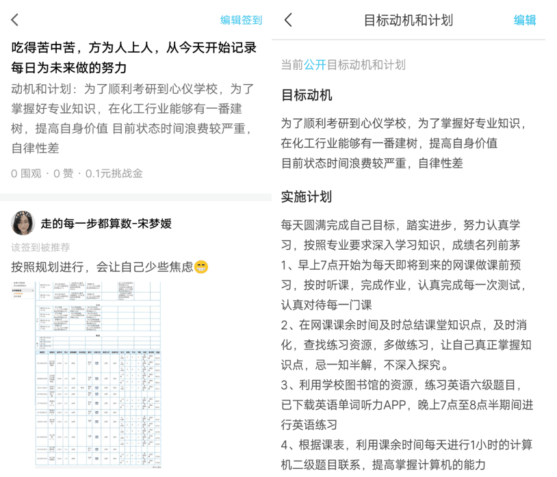 同学预习笔记 线上学习更注重个人学习主动性与前期的准备。化工2018级三班的同学们还创建了“目标动机和计划”公开版,大家在公开版上树立目标,制定计划并进行自我反思。宋梦嫒表示“要想跟上老师的节奏,必须提前预习,同时,每堂课后还要及时消化。”于是,宋梦嫒在内的同学们,根据老师的指导,提前自主安排学习活动(上课前规划好预习时间,备齐学习资料,课后及时通过联络群中的学习资源进行自我检测,有同学在公开版上写到:“吃得苦中苦,方为人上人,从今天开始记录每日为未来做的努力。”