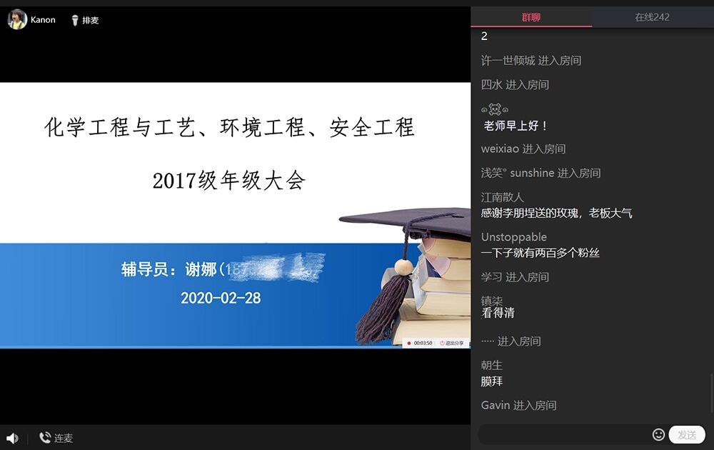 当前疫情防控处于攻坚阶段,也是辅导员育人育心,开展思想政治教育的关键时期。教育不掉线,成长无间断,为保证2020年春季学期开学工作顺利进行,汇聚疫情防控青年力量,引导学生明确责任担当,树立必胜信心,开学之初,化工院面向全院近2000名学生开展线上年级大会。 会上,各地学生家长也与学生一道,就学情分析、疫情防控、安全教育、个人发展规划、居家学习等,与辅导员进行了线上交流。 2019级辅导员曾雅清带领同学与家长“互动式”分析第一学期学习情况,做好新学期个人成长规划;辅导员张铭以“2020不重启!师生齐心共战疫”为主题,叮嘱同学们认真做好健康状况填报,对自己和他人负责,转变学习观念,养成学习自律意识。 针对2018级同学心态转变与个人规划逐渐完善的特点,辅导员郑璇通过“以‘疫’为鉴,勤学笃志”的线上班会,引导同学们将学习与青年责任充分结合,提升学习自主性;辅导员蔡小茵以班级提升计划为抓手,引导学生在居家防控学习生活中,做到自助助人,增强班级凝聚力。 对于正处于考研与就业等多重选择的2017级学子,辅导员谢娜结合教学安排,鼓励同学们在学有余力的同时,发挥学习主动性组建专项学习线上小组,满足自身成长需求;此外,辅导员杨磊就目前疫情防控形势,强调安全教育及防诈骗教育,并对学校疫情期间相关规定进行说明,提醒学生及家长提高警惕性。 面对2016级学生中存在的毕业压力、求职焦虑等问题,辅导员阚文华从毕业设计时间安排、求职决策等方面进行阐述,鼓励同学们做好相关面试准备,及时开展线上求职;辅导员宋姝蕾还从心理健康角度,对于毕业季学生中存在的焦虑问题进行分析,引导学生缓解压力,从容开展毕业季相关工作。 “我相信,安排好自己的居家学习生活,以个人之小我,推动社会之大我,等我们回到梦溪湖边时,一定会是更好的你我。”2018级化学工程与工艺王文韬同学在会议交流时说道。 本次线上年级会议通过线上签到、清点直播人数等方式来掌握到会情况,进行实时督促,并与家长进行线上沟通,通过家校联动,共同做好对学生的教育引导。