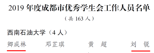 近期,成都市学生联合会公布了成都市优秀学生分会(研究生会),优秀学生会(研究生会)工作人员评选名单。化工院学生会荣获“成都市优秀学生分会”称号,我院刘锐与卿成林获“成都市优秀学生会工作人员”称号。 化工院学生会秉承“为学生服务”的宗旨,积极引领化工学子坚定理想信念,服务学生成长成才,围绕学生开展了一系列健康有益、丰富多彩的校园文化活动,在师生中反响良好。 在新冠肺炎疫情防控期间,学生会挖掘教育元素,策划开展了积极学习回信精神、清明时节缅怀抗疫英雄、争做正能量发声人、爱国力行作品征集等系列活动,做好学生的引路人,不信谣不传谣不造谣,引导青年学子在奋斗中绽放青春之花。 本项评选自2019年12月启动以来,旨在进一步树立先进典型,鼓励各校学生会坚持以习近平新时代中国特色社会主义思想为指导,充分发挥出桥梁纽带作用,起到积极的领导带头作用。本次评选,经组织申报、学校初评公示、市级评审,共授予全市54个组织“优秀学生分会”称号,163 名同学“优秀学生会工作人员”称号。