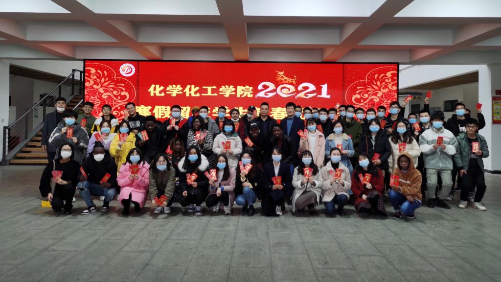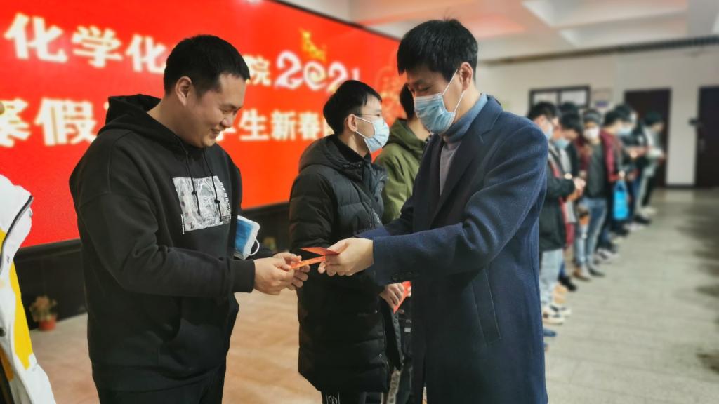 2021年2月10日15:00,化学化工学院2021年寒假留校学生迎春团拜会在明德楼A523举行。化工院党委副书记、纪委书记陈刚,副院长张辉,辅导员代表,全院留校学生和留学生共计52人齐聚一堂,欢庆牛年新春佳节,共话学院美好未来。 团拜会上,学院领导还给每位学生派送了200元“压岁包”(学校100元慰问金+学院100元新春红包)、除夕夜晚餐券,为春节不能回家和亲人团聚的学生们“压岁”。辅导员们亲切地与留校学生交谈,了解他们的假期生活安排,提醒学生们在校做好个人防护。学生们纷纷与老师们合影留念。 在本次团拜会上,陈刚向学生们了解留校原因,和同学们深入地交流,倾听同学们的心声,特别指出有困难的同学可以随时向学院寻求帮助。他再三嘱咐同学们积极关注疫情发展,做好个人防护,主动遵守留校相关安排,齐心协力共抗疫情。张辉建议留校学生合理安排近期的学习规划,加强体育锻炼,常和家人、同学联系,学会自我身心调节,并向同学们传达了学院领导的关心并送上新春佳节的祝福。 经过此次慰问,留校学生们深切感受到了校院两级领导、老师对他们留校期间学习、生活的关心,纷纷表示感谢。“虽然家乡远在千里,但有老师的陪伴和关爱,让我感到无比幸福与温暖!”来自河北的李保福说,他准备利用寒假留校的时间,好好准备明年研究生考试。来自利比里亚的留学生EZIE则表示:“在学校感受到了回家的温暖。疫情在中国得到了控制,感受到了中国伟大!”
