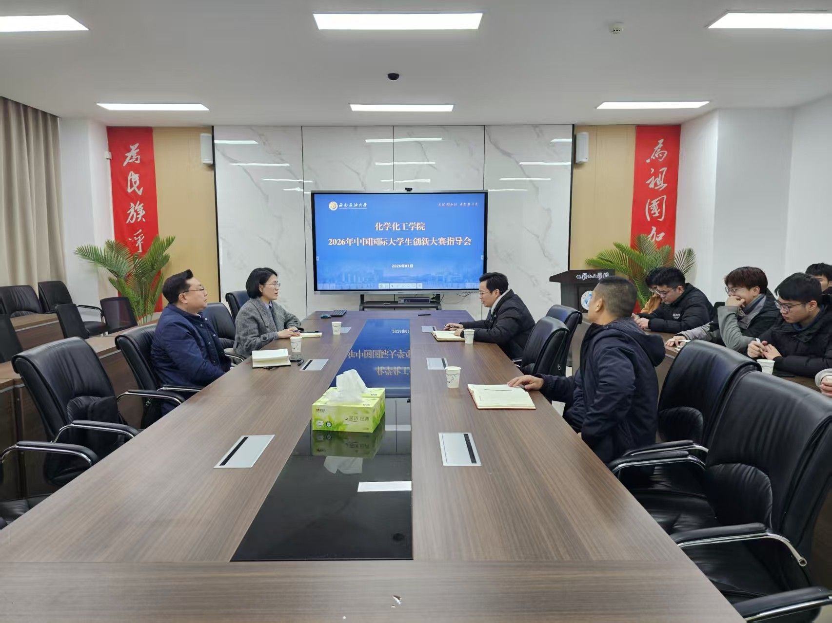 1月21日,化工院在明德楼A527召开2026年中国国际大学生创新大赛指导动员会。大学生创新创业中心主任姚利、副主任李媛媛应邀作大赛备赛专项指导。学院党委副书记章志华、副院长陈永东及备赛学生代表参会。 姚利结合学校备赛工作整体部署,对学院双创工作成效及备赛推进情况给予充分肯定,并针对国创赛提出指导意见,强调要立足化工专业优势,强化跨学科协作,提升项目核心竞争力。李媛媛则围绕申报材料规范、路演答辩技巧等实操环节,为备赛学子提供具体指导。 章志华代表学院对姚利一行的到来表示欢迎,表示学院将全力做好备赛保障工作,推动双创教育与人才培养深度融合,为参赛团队保驾护航。陈永东结合学科特色,鼓励学生聚焦“双碳”战略、绿色化工等领域挖掘项目创新点,扎实推进备赛各项工作。 互动环节,备赛学生踊跃提问,现场交流氛围浓厚。下一步,学院将持续落实指导意见,完善双创育人机制,深耕优质项目培育,力争在2026年国创赛中再创佳绩。