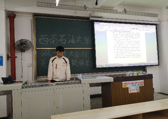 图2 主持人诵读贺信 三封贺信及报告极大的激励了在座学生,大家也对此进行了深入的讨论与交流。应用化学一班唐林说到,听完贺信,又让他回想起了校庆那天博学广场上各学院校友报到时热闹的场景,特别是60周年校庆晚会,精彩绝伦的节目让他记忆尤深,双一流推进会的贺信也让他切身感受到作为一名西油人的自豪与骄傲。应用化学四班陈紫薇说到,听完赵校长的报告,她更加了解了学校的发展历程,心里充满自豪感,也很开心能够进入西南石油求学,她还说到要认真完成自己的学业规划,努力提高学业水平,不愧对西油的培养以及父母的期望。 此次班会让同学们知晓了学校发展的丰硕成果,激发了大家的热情。与会同学纷纷表示,我们是千禧宝宝,同时也是西南石油的新生力量,未来要承担起发展西油的责任。我们要秉承“为祖国加油、为民族争气”的学校精神,积极向上,努力奋斗,全面发展自己,努力让西南石油大学变得更加美好!(文/图 李貌)