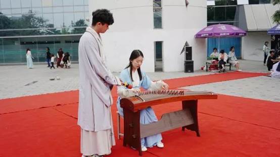一切准备就绪后,主持人李嘉林和蒋蝶为大家介绍本次活动目的--让更多的人了解汉服,认识汉服并且喜欢上汉服,同时以汉服为载体弘扬我国优秀的传统文化。活动以一支水袖独舞《杯中有雪》开场,紧接着是传统形制的汉服秀--《漪兰德芳》,才子佳人们踩着乐点娉娉袅袅向大家走来,主持人根据走秀顺序一一向观众介绍相关形制的汉服。传统汉服秀结束后由我院安全工程专业罗雨菲带来一曲古筝独奏《琵琶语》,身着汉家衣裳,奏我华夏名章。为了让汉服更深入我们的生活,汉服混搭秀《织梦今朝》在渐渐消散的古筝声中开始,模特们将我们现代的时装与汉服结合起来,展现汉服又一种风采,有立领的混搭,有宋裤宋抹的混搭,有褙子的混搭,有传统与时尚的碰撞,让汉服更融入我们的生活。