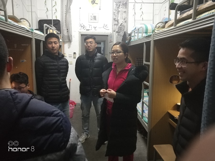 为加强寝室管理,培养学生良好的生活习惯,营造健康文明、和谐有序的学习生活环境。3月24日21:00化工院15级辅导员阚文华和曾雅清两位老师对2015级男生寝室进行例行检查,同时全面了解学生就业及研究生复试情况。 寝室安全关乎每一个学生的切身利益,为了督促学生做好寝室内务,全面消除寝室安全隐患,2015级深入贯彻学校各项规章制度,制定寝室日常检查制度,每周日晚上进行寝室检查和走访。 检查过程中两位老师对寝室卫生,用电安全等进行了详细检查,并对内务较差的寝室提出批评并要求现场整改。在检查内务的同时,两位老师详细了解了目前研究生复试及就业情况,为同学们把方向,找途径,提建议。(文/仇天富)