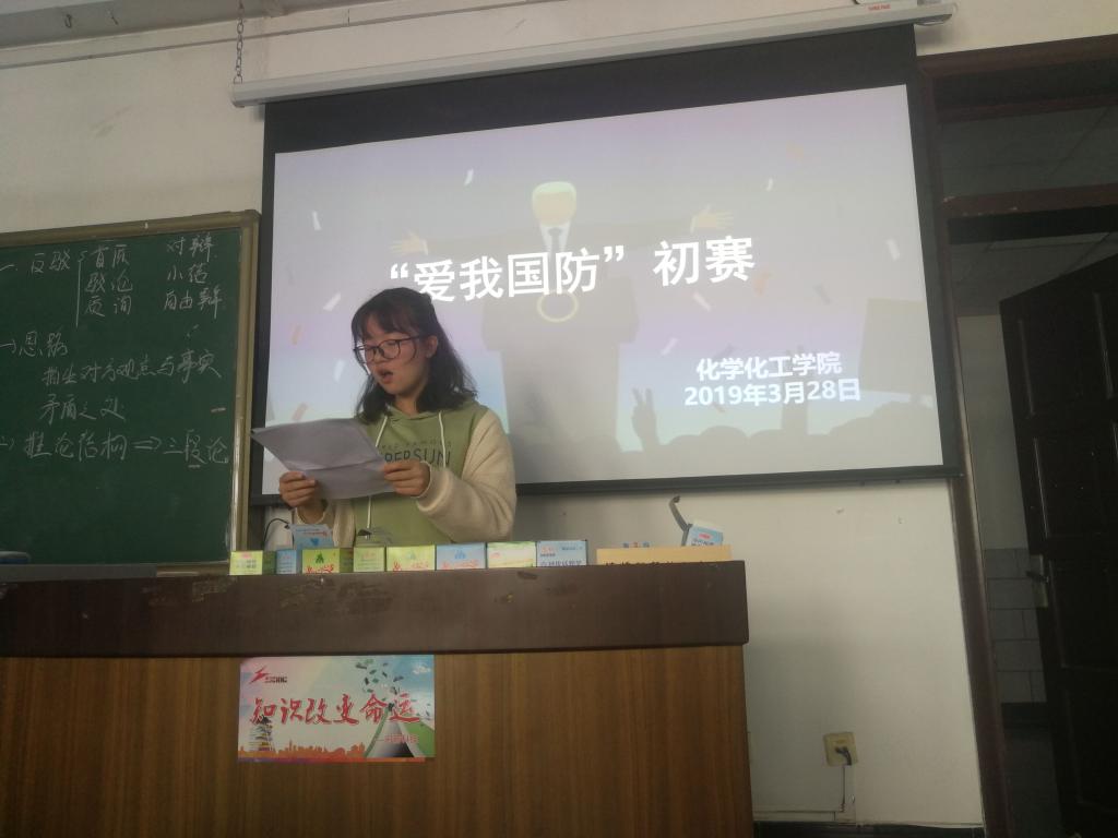 孙子曰:“兵者,国之大事,死生之地,存亡之道,不可不察也。”国防建设从古至今都是一个国家一个民族最重要的安全保证。没有强大的国防,国家经济政治文化建设都无从谈起。为搞好国防教育特色学校建设,激发大学生参军报国的政治热情,在学校举办第三届“爱我国防”大学生主题演讲比赛之际,化工院积极开展选拔,以“砥砺奋进七十载,恭迎伟大新时代”为主题,着力激发大学生传承红色基因,勇担强国强军重任,激发热爱国防、奉献国防的政治热情,旨在激励大学生携笔从戎、报效祖国。 3月28号下午2点半思学楼C301,化工院进行了初赛选拔,本次比赛参赛人员主要为化工院演讲人才库成员,评委由辩论演讲队长单昱博,肖梦丽和范尚华担任。各位参赛队员演讲稿主题鲜明、格调高雅、观点正确、形式多样。 每一位选手演讲结束后,评委都会立即评价并给出指导性意见,关于演讲稿内容的修正,语速的细节调整,舞台风格的展现等等,在交流中更深的讨论主题意义与精神,快速提升参赛选手的演讲技术和主题理解。在初赛结束时肖梦丽评委更是用其中几个参赛选手的稿子进行再次演绎,向我们展示演讲中应注意的技巧与重点。最后,本次活动以同学们演讲能力提高和对“爱我国防”主题理解深度提高的结果圆满结束,相信无论是选手还是听众,都收获良多。很多同学结束后都表示希望以后还有更多机会参加这种活动,让当代大学生具备更深刻的“国防精神”!
