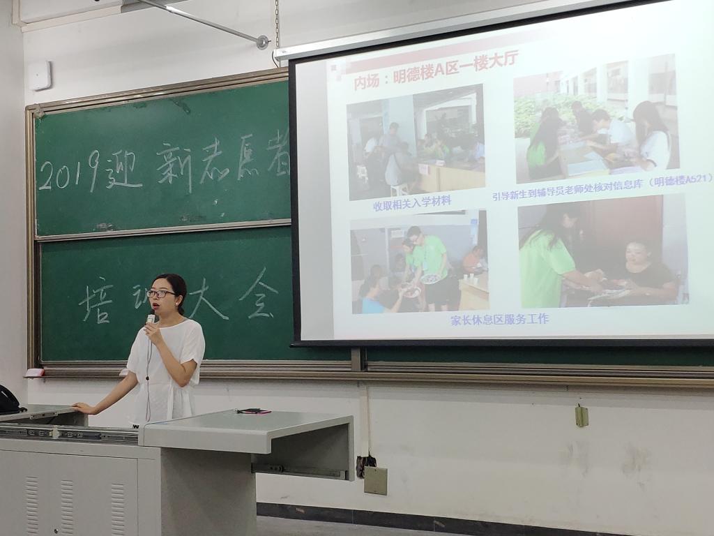 为做好2019年迎新各项工作准备,提高迎新志愿者服务意识水平,9月2日晚20:45,化工院于明德楼A312召开了迎新志愿者培训大会。 培训会上,新生辅导员曾雅清就19级新生概况、迎新工作开展时间、迎新地点及迎新工作注意事项等进行了说明。会议期间,曾雅清强调,在迎新外场值班的志愿者要带着新生逐步进行完所有报到程序;内场的志愿者一定要认真负责地做好新生档案接收工作。曾雅清说到:“我们每个人都是从新生一路走来的,希望大家能够将曾经收到的爱与关怀传递下去,怀着高度的责任感投入到工作中,让新生在入校初期少一些不适,多一些归属感。” 随后,辅导员曾雅清和张铭分别就班导生的工作安排以及学校迎新系统的操作方式为班导生及相关负责同学进行了详细讲解,强调要将迎新工作落到实处。 培训会结束后,新生班导生李周缘表示:“经过今天的培训会,我感受到了我身上的担子的重量,我和我的伙伴们,一定都会尽自己最大努力完成迎新工作的!”(文/秦佳雯 图/朱玮)