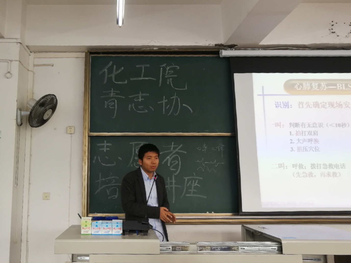 11月21日下午两点半,化工院青志协在思学楼A218举办志愿者培训讲座。本次讲座主讲人为西南石油大学校医院的医生邹剑戎。 讲座上,邹剑戎结合PPT,为大家讲解心肺复苏的相关知识。他从专业的角度,向同学们解释了心脏骤停的原因,并介绍了生存链等延伸知识。讲解时间,邹剑戎多次强调心脏骤停的严重后果,他提醒同学们,要注意自己的生活习惯,少冲动、不熬夜,增强锻炼,加强体质。 随后,邹剑戎为志愿者们讲解心肺复苏过程中胸部按压、开放气道和人工呼吸等重要步骤的相关操作及注意事项。在胸部按压部分,他通过结合胸骨下1/3交界处、胸骨下陷至少5cm等数据来加强同学们对按压部位的记忆。 讲座接近尾声时,邹剑戎为志愿者们补充讲解了有关血液和献血的知识,为同学们解答了相关疑惑,并呼吁大家积极参加献血活动。 讲座结束后,参加本次志愿者培训讲座的18级环境工程专业李周缘表示:“这次培训讲座,让我们了解到更多关于心肺复苏和无偿献血的知识,希望经过一些训练,我可以在紧急情况下,将这些知识运用起来。”(文/李惹地莫 图/彭雪莲)