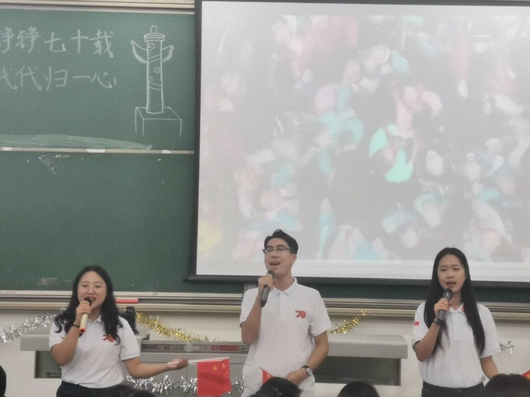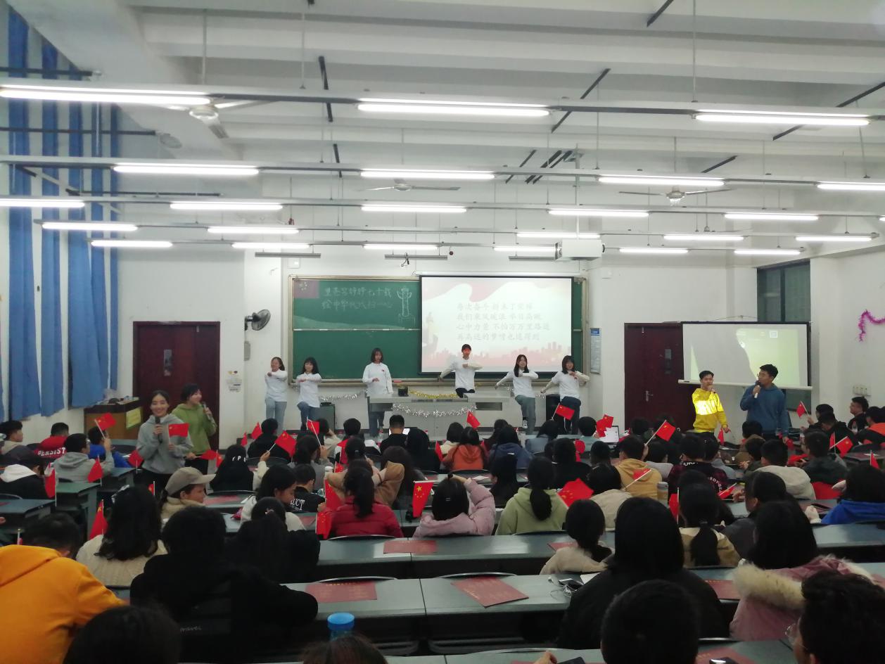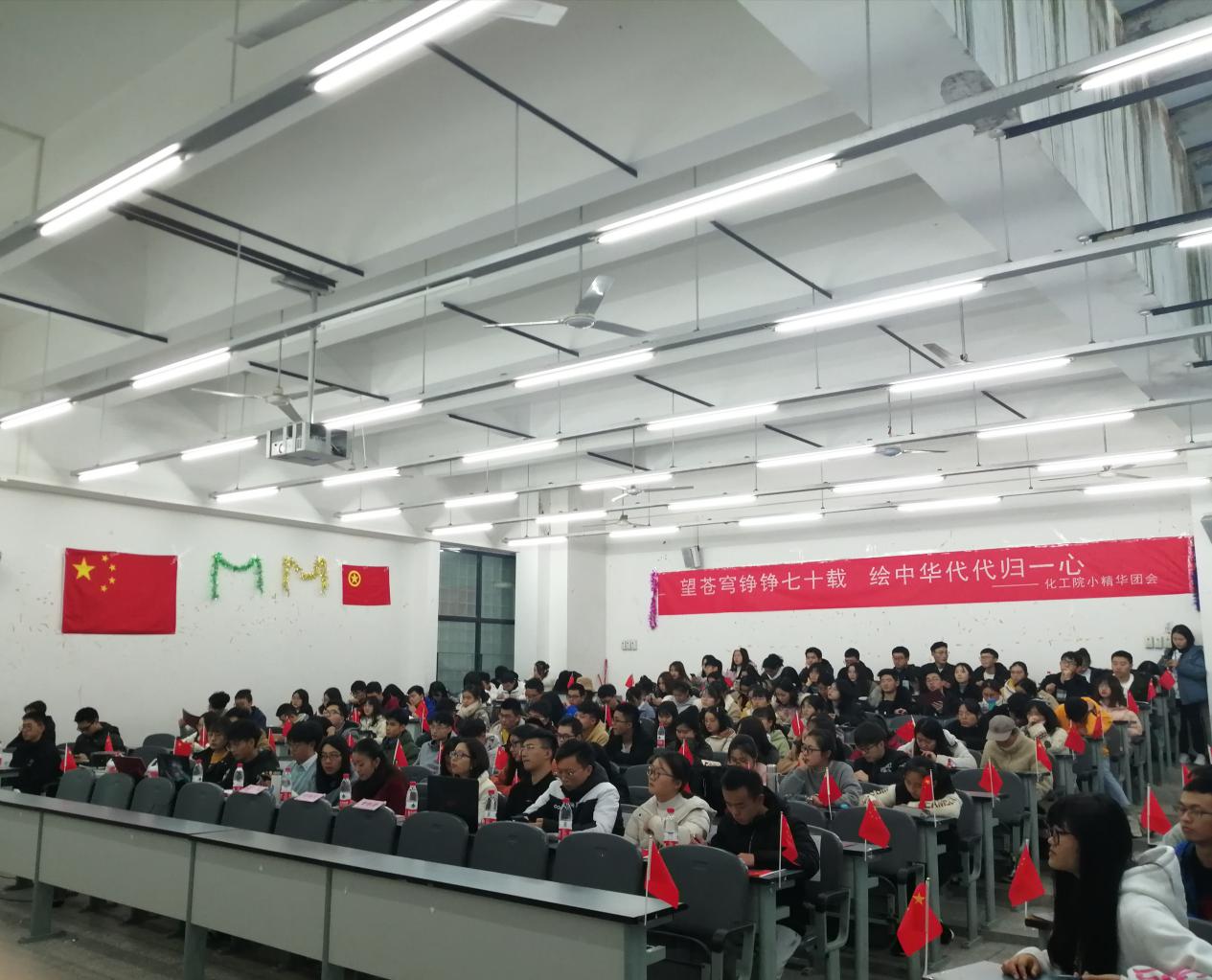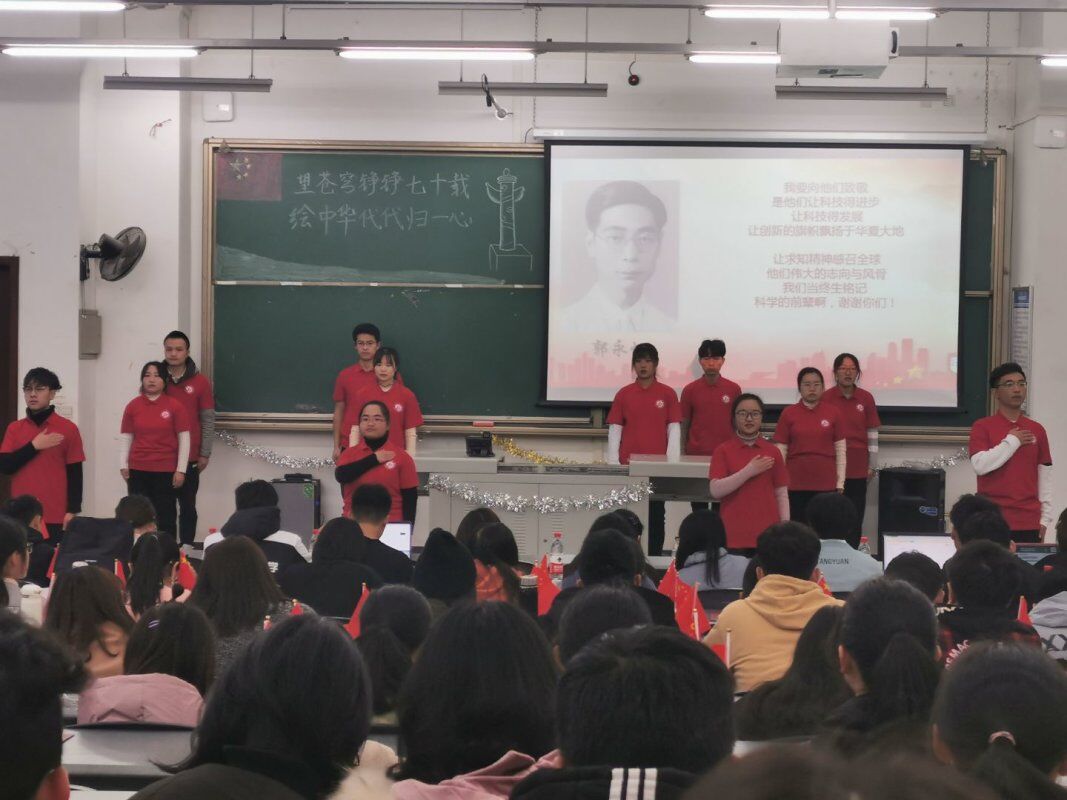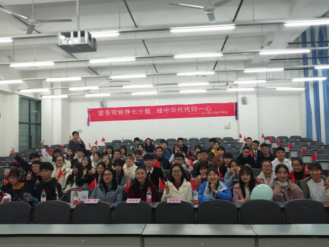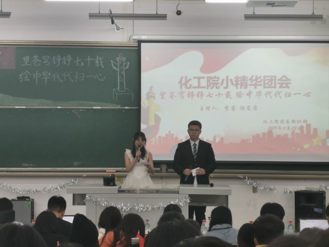 为庆祝中华人民共和国成立70周年,弘扬爱国主义精神。11月28日下午4点,化工院于明德楼A312举行了“望苍穹铮铮七十载,绘中华代代归一心”小精华主题团会。本次团会由李睿、杨茏茵主持,出席本次团会的评委及嘉宾分别是校团委付相宜,化学化工院团委书记郑璇,化学化工院团委副书记曾雅清,校组织部部长以及各学院的组织部部长。 本次团会向我们展示了:歌曲——强国一代有我在、化学生僻字;话剧——共和国之恋、战火中的大学生;朗诵——致敬;情景朗诵——马兰谣等极具爱国主义精神的节目。歌曲采用演唱者从现场几个地方上台汇合的形式,象征着大家从五湖四海赶来为祖国庆生,为祖国歌唱。话剧更是将现场投射回抗战时期,展现了当时中华儿女坚持维护国家利益,保护国家安全的决心,不为敌人口中的繁荣富贵所动,坚持爱国护国初心的情景。当剧中女大学生强烈指责卖国贼,“殴打”卖国贼的时候,现场热烈的掌声是对剧中演员的肯定,更是对当时的敢于反抗的大学生们的肯定。朗诵及情景朗诵则是用慷慨激昂的语言,传递着对祖国的赞美,对祖国的热爱,对祖国成立七十周年的庆贺。团会的最后一个节目合唱——我们都是追梦人,合唱加伴舞,传达了对祖国更加繁荣昌盛的美好祝愿,表达了对未来的美好期待。 团会最后,主持人总结到:祖国,每一个人心中的一片净土,中国,每一个炎黄子孙的梦。它,久经风霜,活出了倔强;它,久经磨砺,活出了坚强;它久经沧桑,活出了富强。它就是中华人民共和国,我们在这里献礼祖国70载,在这里共筑中华复兴梦。 团会结束后,评委及嘉宾与全体表演人员合影留恋。化学化工院2019级的张一丹同学表示:“作为本次小精华主题团会的参演人员之一,我深刻的体会到了参演人员的不容易,看到团会完美结束,我几乎感动到哽咽。日后,我会像对待小精华团会一样对待所有事,全力以赴,我会从小事做起,勤奋学习。”(文/彭雪莲 图/张慧玲 刘新龙)