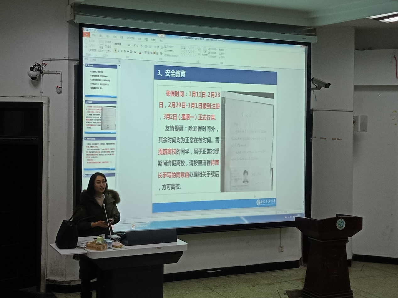 学期末临近,12月13日下午,应用化学、环境工程2018级于思学楼C210召开专业年级大会,会议由化学化工学院2018级辅导员蔡小茵主持,应用化学、环境工程2018级全体同学到场本次大会。 会上,蔡小茵对本学期同学们的学习及生活情况做出了总结。她还针对四、六级考试以及今后会面临的考试,列出了学生手册中若干条关于考场纪律的规定以及相应惩处,着重强调诚信考试,提醒同学们积极备考、诚信应考。同时,基于本学期课堂出勤情况,蔡小茵指出,要严格课堂纪律,严肃请假制度,不得事后找借口。 对于近期体测及宿舍内务安全所反映的情况,蔡小茵表示,希望同学们在生活中要加强身体素质锻炼,合理作息;同时强调要重视寝室内务建设,严禁擅自外出、夜不归宿的情况,假期离校要严格遵守相关请假制度。 最后,寒假即将来临,蔡老师对学校放假安排及相关注意事项进行了说明,并强调了离校安全问题,嘱咐同学们要严格遵守学校规章制度,在离校前要办理相关的请假手续,在假期中注意自身安全、财产安全。(文/图 张冬梅)