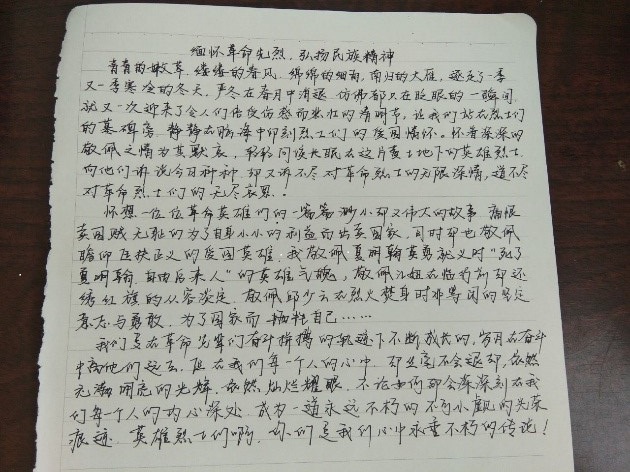 2020年4月4日至11日化工院青志协通过线上发动起“铭记历史,缅怀先烈”网络征文活动。疫情当前,志愿活动仍在进行。通过线上号召此次征文活动,带动同学们忆苦思甜,表达当代青年对英雄前辈的崇高敬意与怀念。 清明时节,化工院青志协开展以文字书信形式的缅怀历史志愿活动,同学们在回顾革命故事后,可通过微信、QQ以及微博等多种社交媒介方式可以将书信内容传达给收集同学来展示,以此来表达自己内心的感激和致敬革命先烈永不妥协的革命精神。 立足今天,放眼于未来。当代青年应不忘初心,牢记使命。同学们应当铭记高矗的胜利丰碑是无数先烈用热血和头颅垒就,应主动在祖国建设当中担负责任,与国共进,尽自己最大力量去创造新奇迹。当代青年学生应明确自己的使命与担当,秉承不变的时代精神,创新带动国家共同发展。 2019级化学专业黄烈洪同学说:“弥漫于中国大地的硝烟早已在人们的印象里泯灭,但是每一次的牺牲都应当铭记。此次活动的顺利举行,展现了我院学子积极向上的精神面貌,体现了当代青年主动肩负责任,与国共进的赤诚之心。感谢英雄先烈的付出,我们将秉承革命精神,在祖国的发展中尽自己的最大力量。”(文/黄烈宏 图/胡丹丹)