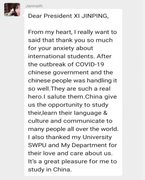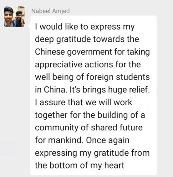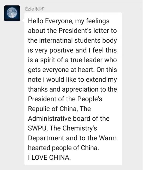 5月17日,在习近平总书记给北京科技大学全体巴基斯坦留学生的回信中,对各国优秀青年来华学习深造表示欢迎,鼓励他们多同中国青年交流,同世界各国青年一道,携手为促进民心相通、推动构建人类命运共同体贡献力量。 习近平主席的回信被翻译成了多语言版本,在留学生群体中广泛传阅,学生们学习热情很高。2020年5月28日,化工院面向国际学生开展习近平总书记重要回信精神的专题学习。会议由国际学生辅导员曾雅清主持,会上,曾老师向留学生告知了中国政府和学校始终关心着在华留学生的生命健康安全,为大家提供全方位的帮助;鼓励留学生主动对外宣传疫情期间中国政府和中国人民所做出的努力,以及为全球抗疫做出的积极贡献;敦促仍在中国境外的国际学生,做好居家防疫和疫情防控,主动与学校保持联系,未接到学校返校通知前暂不返校。经过老师系统地讲解回信精神,留学生们对“人类命运共同体”,“一带一路”这些概念有了更明晰的认识。 在会上,来自利比里亚的留学生EZIE说:“疫情期间我一直都在中国,亲眼见证了中国人民为抗疫做出的贡献,这种努力是很伟大的,我爱中国。” 来自巴基斯坦的SHOAIB说:“中国在疫情期间帮助过我的国家,我和我的家人都很感激中国,我会把我在中国的故事告诉给我的朋友们,让他们也知道中国,爱上中国。” 除此之外,学院也以这次学习为契机,进一步加强了国际学生的教育管理工作。一是加强对国际学生的法律法规、国情校情、校规校纪方面的教育,遵纪守法,才能学有所成;二是组织和引导国际学生参加有益的课外教育活动,增强中外学生的友谊感情,培养留学生“知中华爱中华”的情怀,引导其讲好中国故事,传播中国好声音。