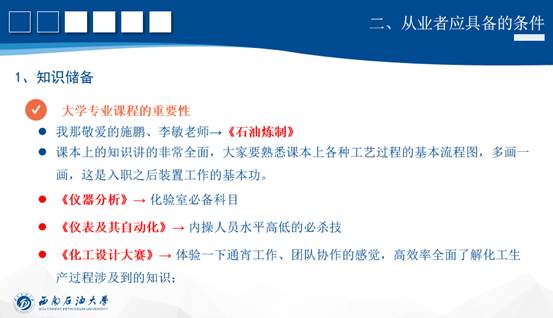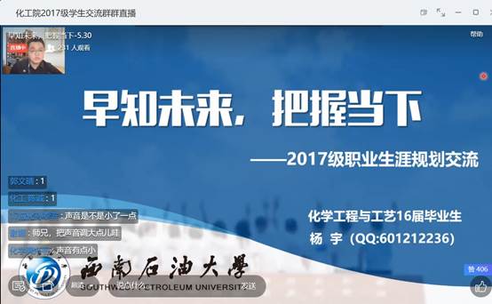 5月30日晚,化工院组织2017级学生开展了第二期线上职场导师职业能力认知系列活动讲座。本次活动邀请到2016届化工毕业生杨宇分享化工领域职场。 杨宇以 “早知未来,把握当下”为题目分享了自己在中海油的三年工作经历。分享会上,杨宇从“当代化工厂的特点”、“从业者应具备的条件”、“从业者的职业发展路径”、“找工作的思路”、“共同聊几个话题”、“个人建议 ”六个方面和同学们进行交流,讲解自己的经历,并分享了自己对“化工工程师”定位的认识与体会。随后,他向同学们介绍了当代化工厂的特点,以及从业者应该具备的条件,他指出,越来越多的化工毕业生对工程师这一身份认识模糊,求职焦虑,对自身专业认识不明,对即将步入的就业岗位认知不足,同学们应该对自己的未来发展方向有充足的了解,让想法变成实际行动,不断向目标前进。 分享会期间,杨宇还就岗位选择、晋升待遇、发展路线等大家较为关心的问题进行了详细阐述。在关于岗位晋升的问题,杨宇表示,这个时代是需要终生学习的时代,想要晋升,关键在于持续学习,只有不断学习提升个人能力,才有更大的晋升机会。同时他也表示,学历的不同在求职时会有一定考量,但入职后更多是岗位上的个人贡献度,不管在哪里认真工作,做出成果才是对自己、对岗位最好的回报。 分享会的最后,同学们在讨论区发表自己的疑问,杨宇与同学们共同讨论并提出自己的建议。他鼓励同学们树立终生学习理念,不断提升自己,在工作中尽可能主动展示个人能力。 活动结束后,2017级化工专业刘波表示,本次活动自己受益良多,让在个人规划方面有了更明确的方向。 主讲人简介:杨宇,2016届化工毕业生,现为中海石油宁波大榭石化生产运行八部150万吨/年重整装置技术员,受聘大榭石化运行工程师,入职三年,通过运行工程师交流平台,自学专业,撰写论文,个人专业能力与职业素质不断提升,获中国海油2019年度安全生产先进个人、大榭石化2019年技术比武金奖、大榭石化优秀技术分析评比一等奖等荣誉。 (文/图 张慧玲)