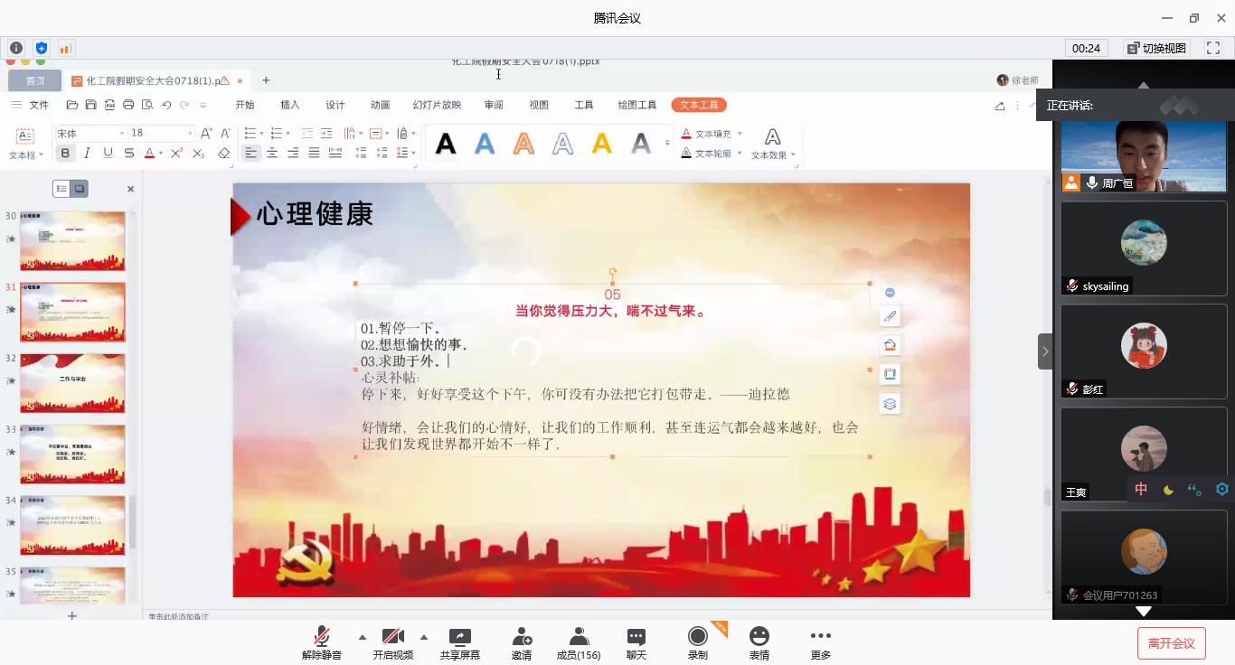 为扎实落实暑期留校学生的安全稳定工作,进一步提高暑期留校研究生的安全防范意识和自我保护能力,7月18日,化工院开展2020年暑期留校研究生安全教育线上会议。会议由研究生辅导员周广恒老师主持,学院全体暑假留校博、硕研究生参加了此次会议。 会上,周广恒结合当下外防输入、内防反弹疫情防控大背景,根据相关规定对暑假留校学生作息时间、点名打卡和个人健康等方面做出要求。他特别指出,在疫情还未消失之前,学院严格管理是对全体在校人员的安全保障和重视。他从禁止学生私自外出、认真执行“晚点名”和“早午晚”检查制度以及防火防盗三个方面对大家提出要求。同时,特殊时期暑期留校是对学生个人的工作学习、心理健康方面的较大考验。他表示:“希望同学们在留校期间认真完成工作,提高学习能力。当然也要调整好自我心态,及时释放压力、舒缓心情。” 学生安全教育与保障一直是学院工作的重中之重。学校高度重视留校学生的安全问题,周广恒表示,希望此次会议能够提升全体暑假留校硕、博研究生安全意识。(文/刘敏)