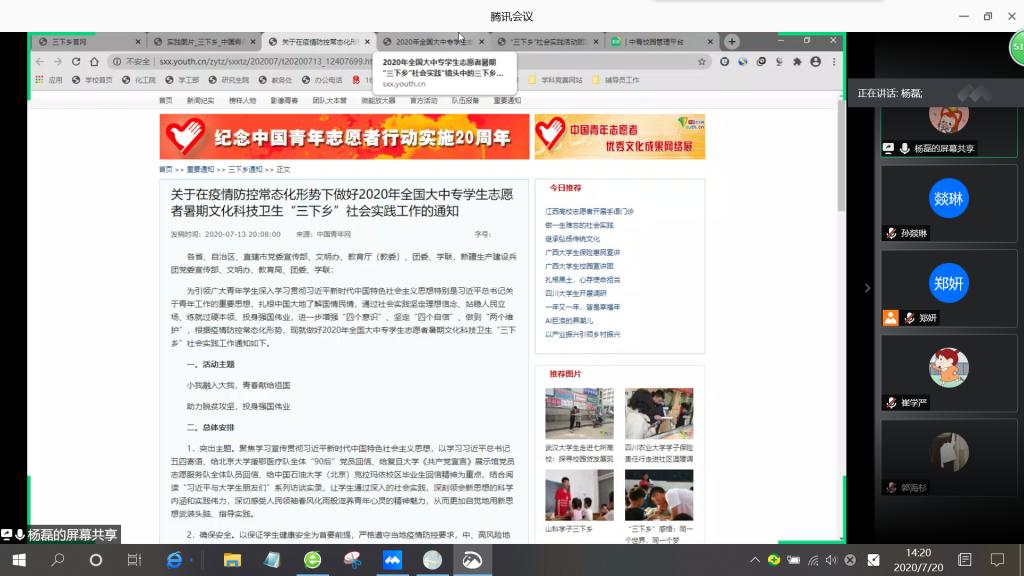 为了帮助青年学生在社会实践中受教育、长才干、作贡献,2020年7月20日下午,化工院在线上举行了“2020年暑期社会实践解读及安全动员大会”,活动邀请到郑璇,曾雅清,杨磊老师为同学们介绍暑期实践的有关内容。 由于疫情的原因,本次活动按照“安全第一,线上为主,就近就便,自愿参与”的原则进行。不开展线下团队实践,以个人实践为主。 会上,主持人郑妍从实践总体原则、主要内容、工作要求等方面解读了我校2020年暑期社会实践活动实施方案。杨磊老师就申报注意事项、暑期社会实践安全等方面进行了提醒和强调,要在疫情防控常态化形势下,克服困难,力争上游,创新模式,全方位做好2020年大学生志愿者暑期“三下乡”社会实践活动。 最后,郑璇老师对参与此次暑期实践活动的同学们给出了自己的建议,一要注意选题,给老师留下深刻印象;二要合理寻找资源,丰富自己的实践内容;三要用心投入,不能像走马观花一样应付差事,每一段文字,每一张图片都要精心考虑。 参与此次活动的2019级同学亚森表示:“之前对于暑期实践三下乡这个活动了解不多,不清楚社会实践要做哪些工作,但经过老师们的讲解与指导,我明确了自己心中的方向,更加清楚自己的目标了。”(文/董鑫杰 图/孙燚琳)